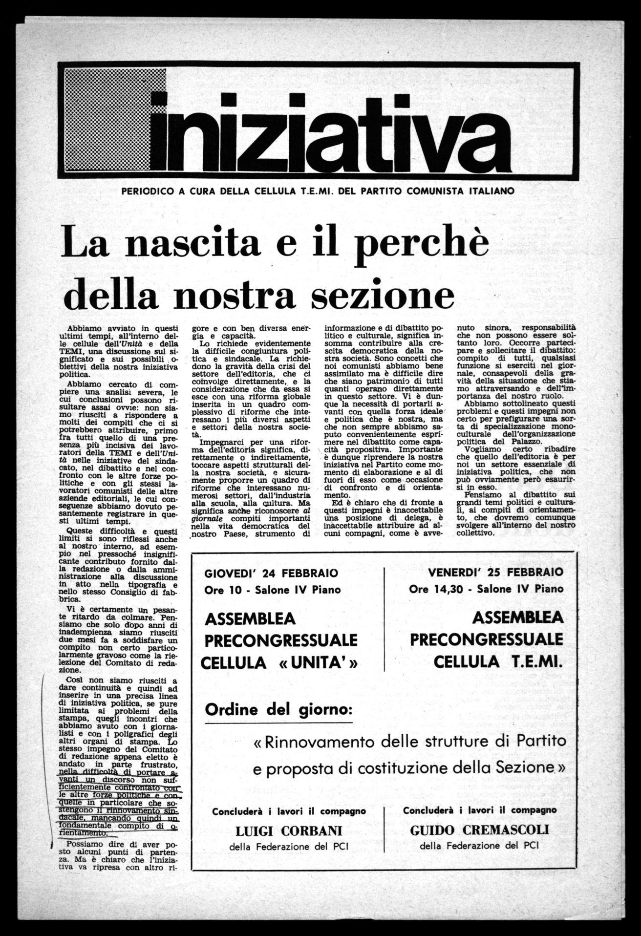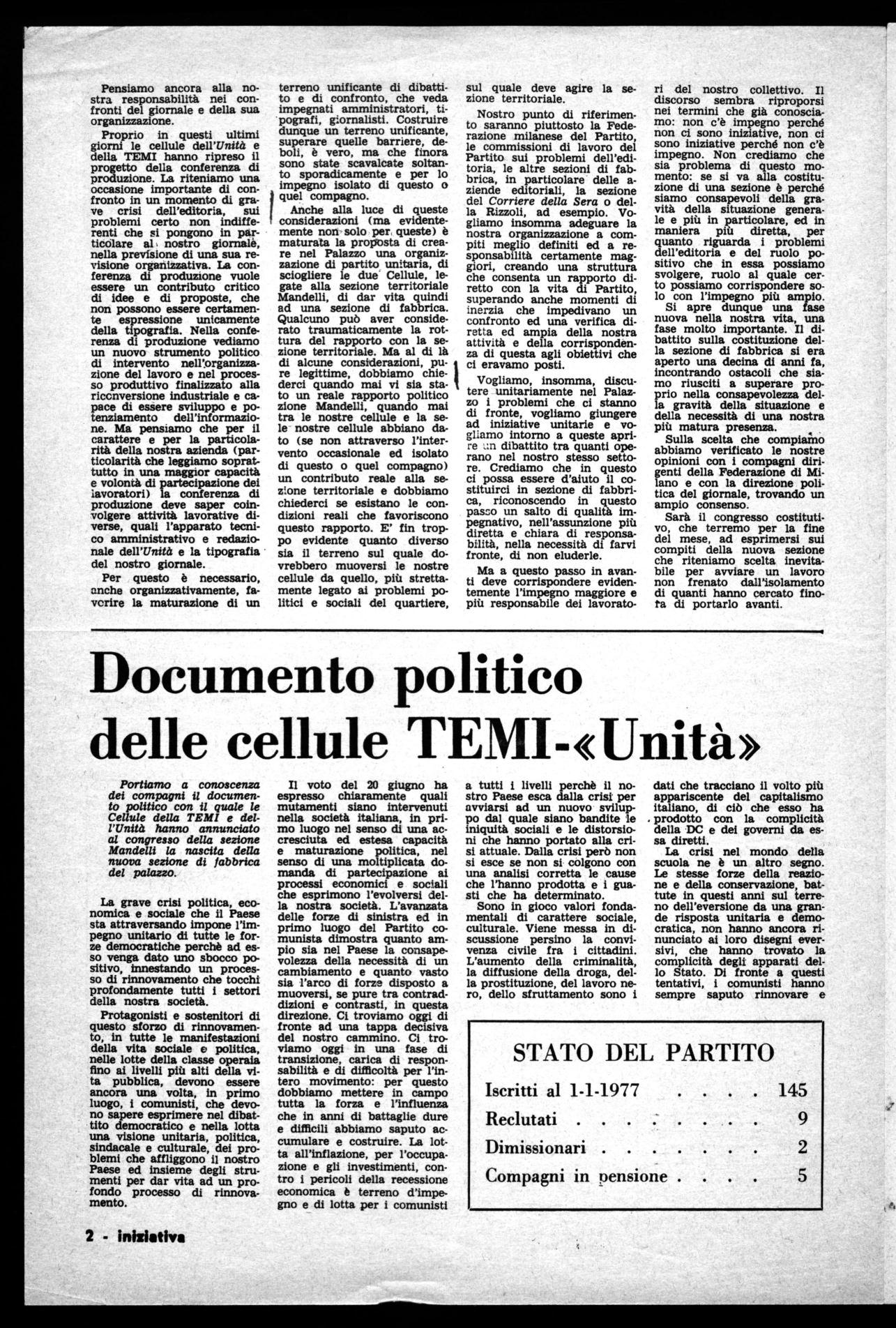 anche sul piano culturale. Vi è dunque la necessità di un impegno assai vasto all'interno del nostro giornale, creando dunque un terreno di dibattito unificante tra la tipografia, la redazione e l'amministrazione del giornale, e all'esterno, nel rapporto con quanti a Milano operano nel settore dell'informazione. Da tutto ciò, è maturato, dopo una adeguata discussione, la esigenza di sciogliere le organizzazioni di Partito nel Palazzo e di far convergere insieme tutti i lavoratori comunisti dell'Unità e della TEMI in un'unica organizzazione, che è la sezione di fabbrica.