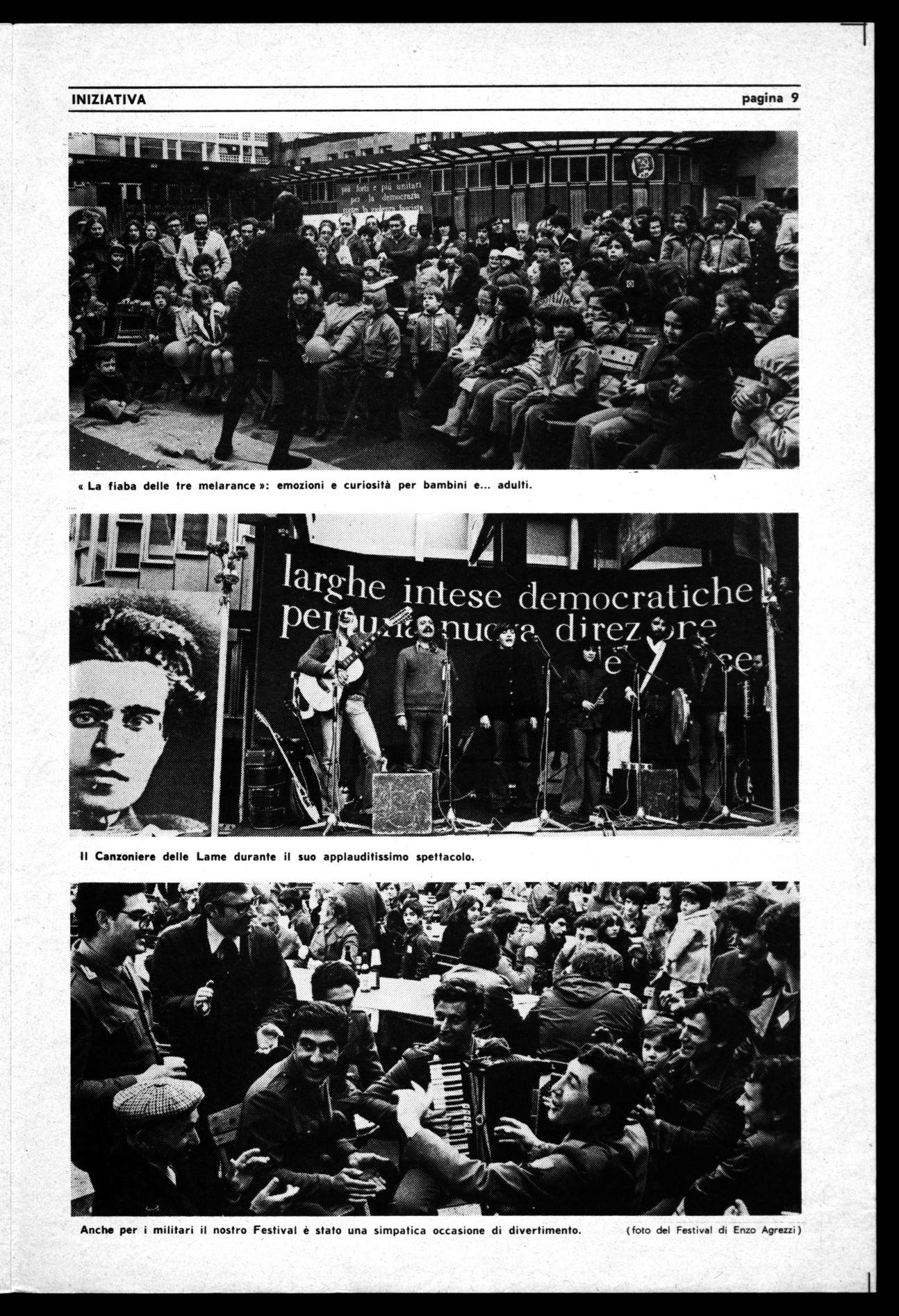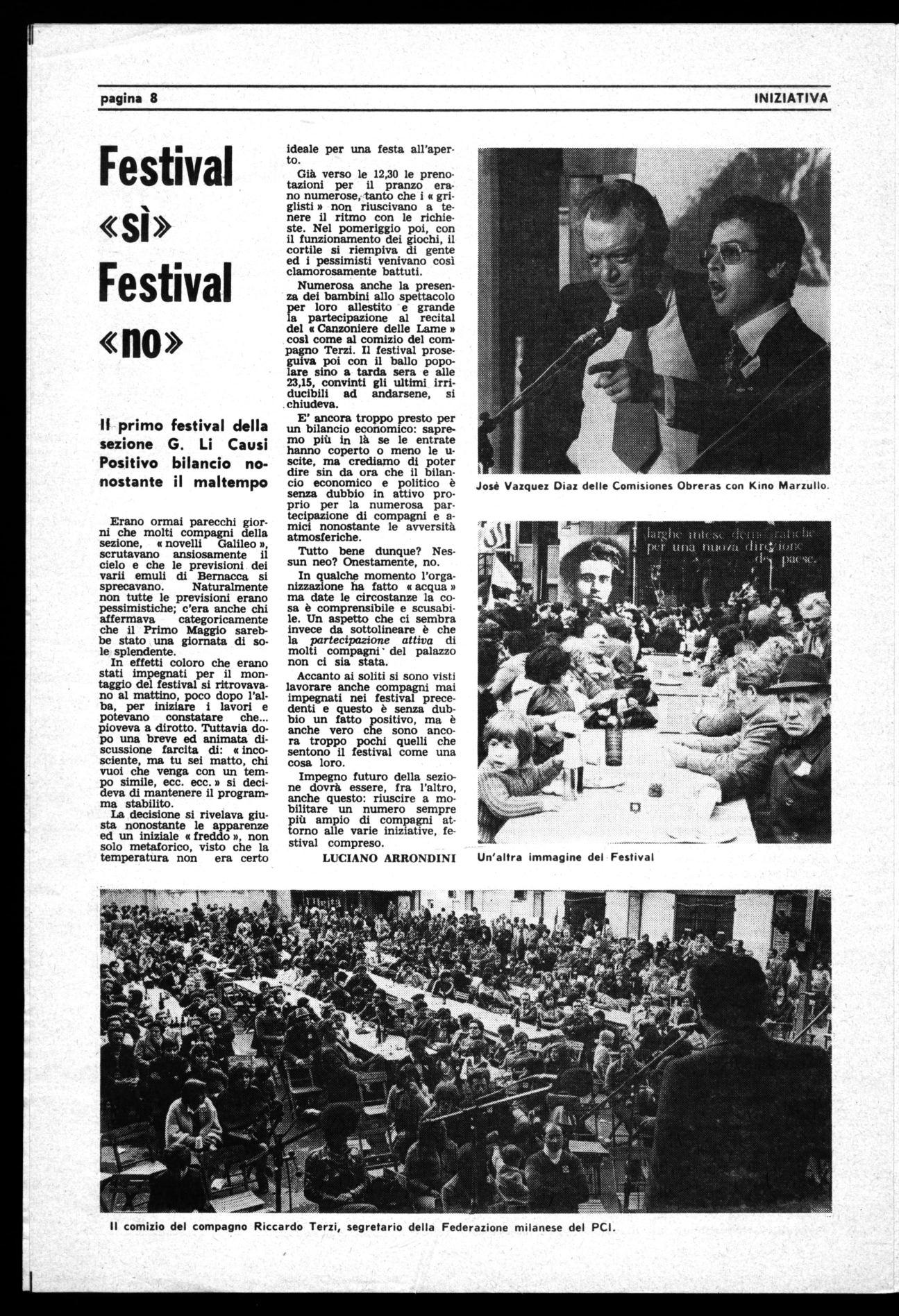 Numerosa anche la presenza dei bambini allo spettacolo per loro allestito e grande la partecipazione al recital del « Canzoniere delle Lame » così come al comizio del compagno Terzi. Il festival proseguiva poi con il ballo popolare sino a tarda sera e alle 23,15, convinti gli ultimi irriducibili ad andarsene, si chiudeva.