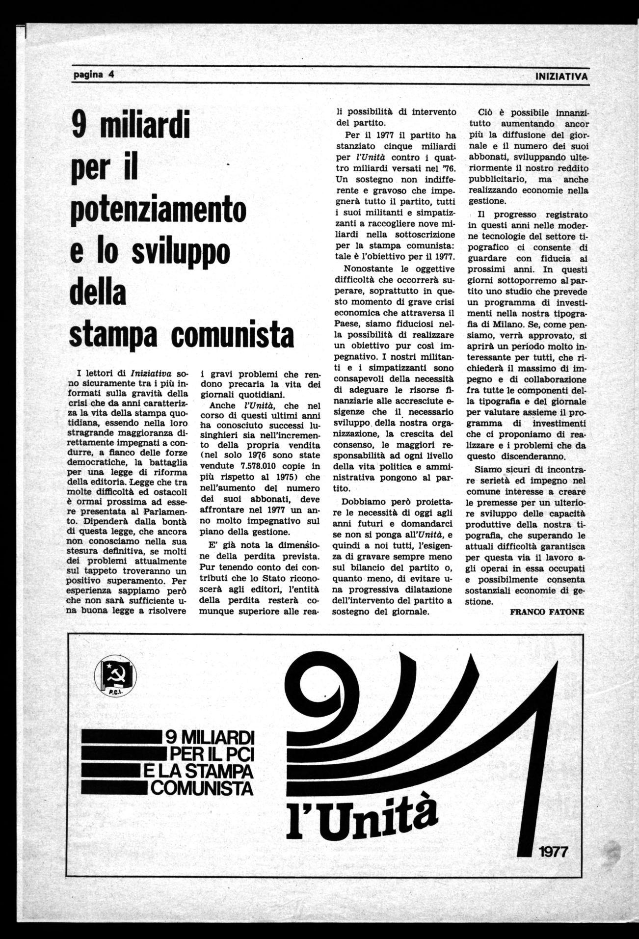 Per il 1977 il partito ha stanziato cinque miliardi per l'Unità contro i quattro miliardi versati nel '76. Un sostegno non indifferente e gravoso che impegnerà tutto il partito, tutti i suoi militanti e simpatizzanti a raccogliere nove miliardi nella sottoscrizione per la stampa comunista: tale è l'obiettivo per il 1977.