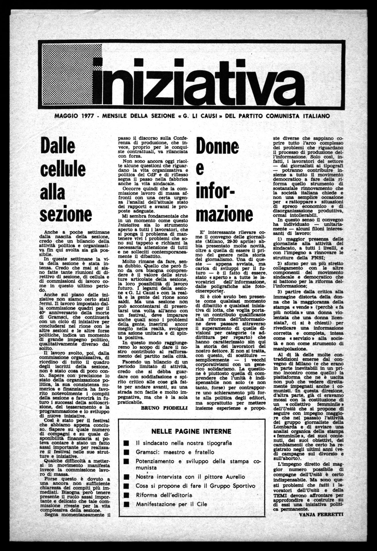 In questa fase di rodaggio della vita della sezione affidiamo ad Iniziativa un ruolo importante: stimolo al dibattito sulla situazione politica e sindacale; approfondimento e analisi dei temi oggetto della nostra conferenza di produzione; collegamento con l'ufficio fabbriche della Federazione milanese del PCI, le altre aziende del settore, con i compagni della GATE di Roma.