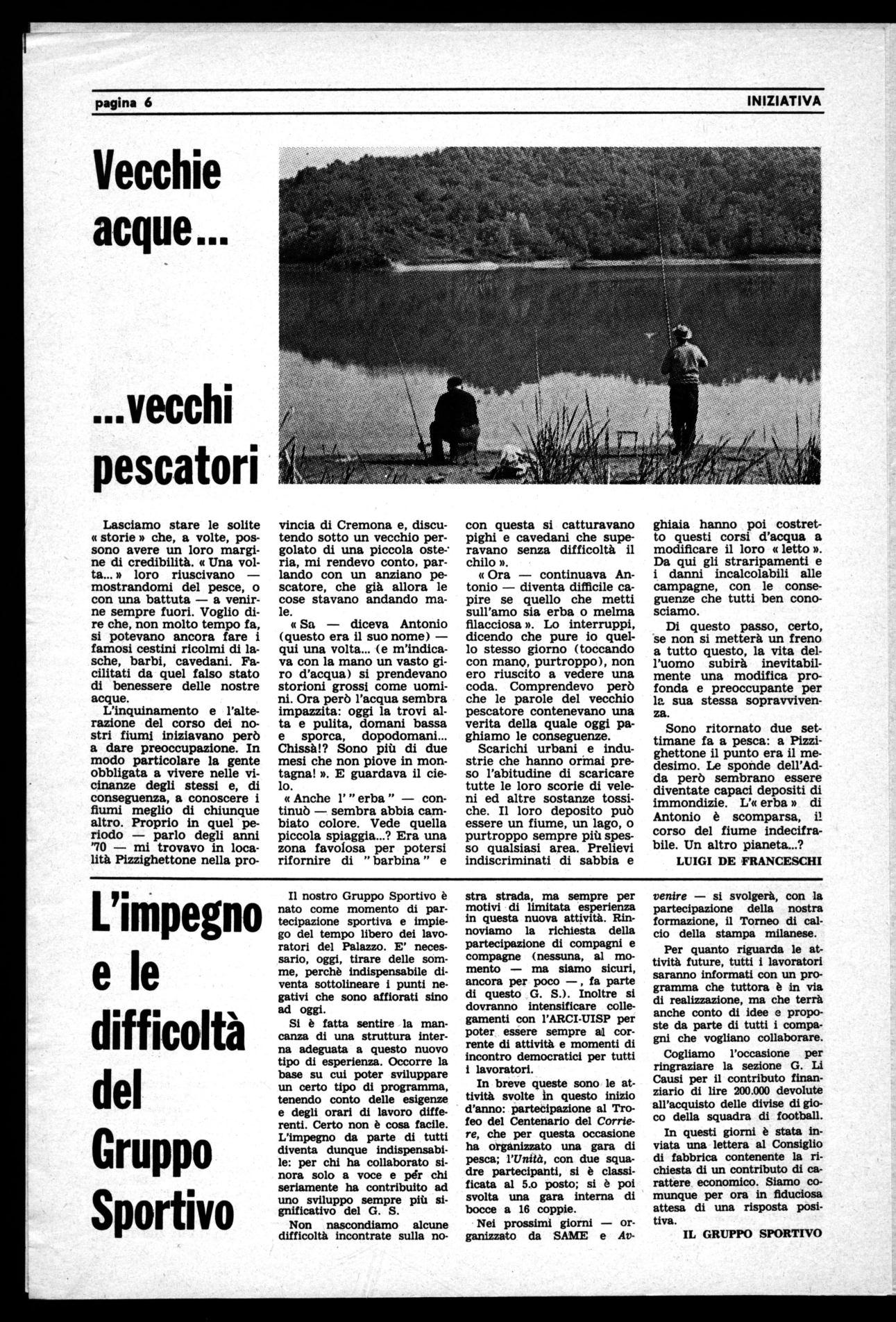 L'inquinamento e l'alterazione del corso dei nostri fiumi iniziavano però a dare preoccupazione. In modo particolare la gente obbligata a vivere nelle vicinanze degli stessi e, di conseguenza, a conoscere i fiumi meglio di chiunque altro. Proprio in quel periodo — parlo degli anni '70 — mi trovavo in località Pizzighettone nella pro-