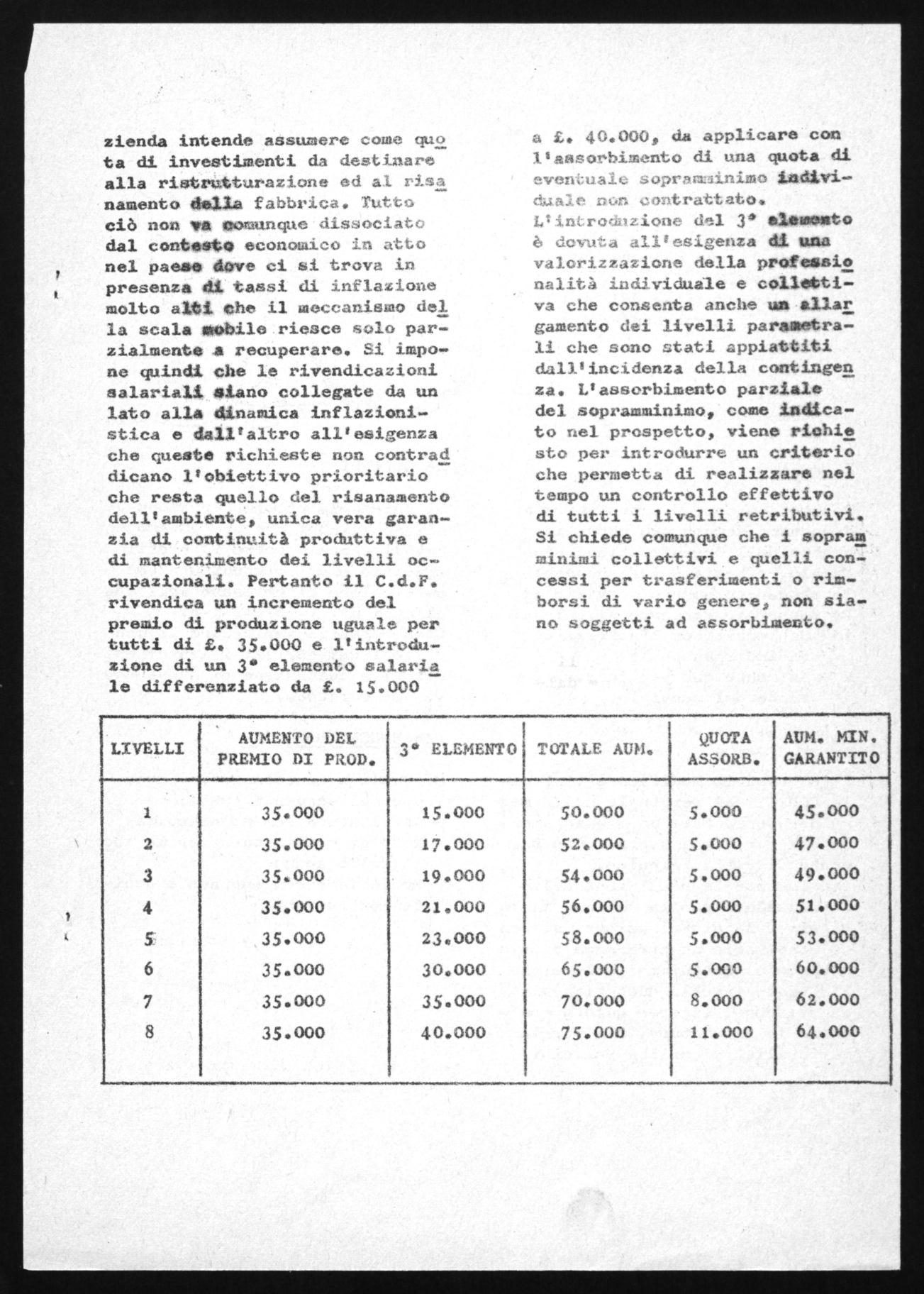 zienda intende assumere come quo ta di investimenti da destinare alla ristrutturazione ed ai risa namento della fabbrlea. Tutto ciò non va coeunque dissociate dal contesto economeco in atho nel paese dove ci si trova in presenza di tassi di inflazione molto alti che il meccanismo del la scala mobile riesce solo parzialmente a recuperare. Si impone quindi che le rivendicazioni aalariali siano collegate da un lato alla dinamica inflazionistica e dall'altro all'esigenza che queste richieste non contrae dicano l'obiettivo prioritario che resta quello del risanamento dell'ambiente, unica vera garanzia di continuità produttiva e di mantenimento dei livelli occupazionali. Pertanto il C.d.F. rivendica un incremento del premio di produzione uguale per tutti di £. 35.000 e l'introduzione di. un 3° elemento salaria le differenziato da E. 15.000