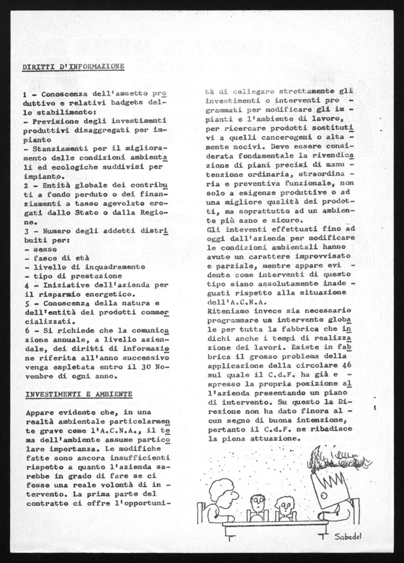 tà 4i collegare strettamente gli investimenti o interventi progremitati per modificare gli Dapianti e l'ambiente di lavoro, per ricercare prodotti sostituti vi a quelli cancerogeni o altamente nocivi. Deve essere considerata fondamentale la rivendica zione di piani precisi di, menutenzione ordinaria, straordinaria e preventiva funzionale, non solo a esigenze produttive o ad una migliore qualità dei prodotti, ma soprattutto ad un ambiente più sano e sicuro. Gli inteventi effettuati fino ad oggi dall'azienda per modificare le condizioni ambientali hanno avuto un carattere improvvisato e parziale, mentre appare evidente come interventi di questo tipo siano assolutamente inade guati rispetto alla situazione dell'A.C.N.A.