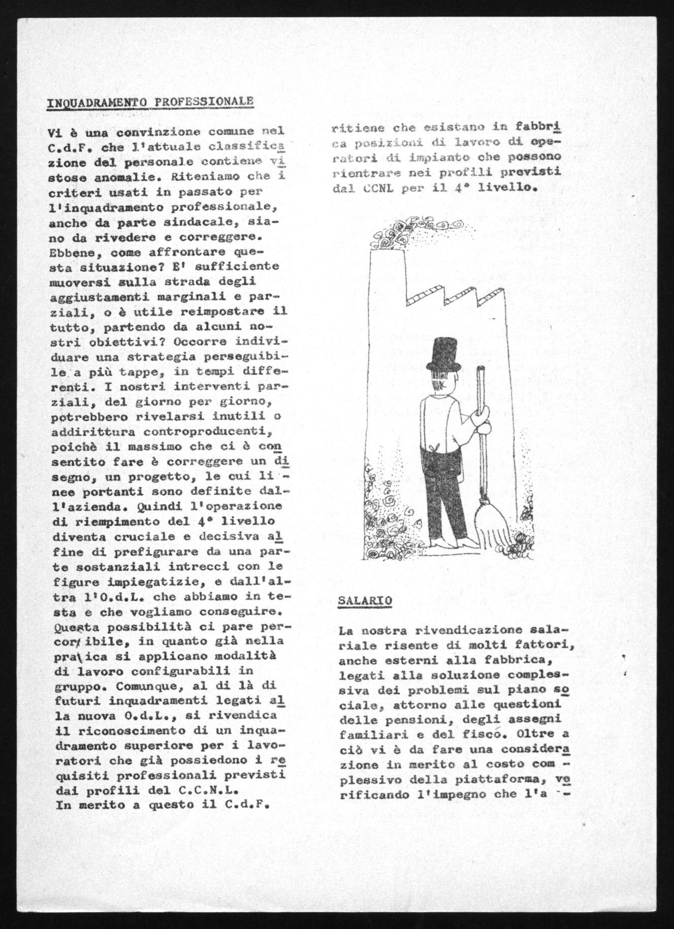 Vi è una convinzione comune nel C.d.F. che l'attuale classifica zione del peesonale contiene T. stese anomalie. Riteniamo che i criteri usati in passato per l'inquadramento professionale, anche da parte sindacale, siano da rivedere e correggere. Ebbene, come affrontare questa situazione? E' sufficiente muoversi sulla strada degli aggiustamenti marginali e parziali, o è utile reimpostare il tutto, partendo da alcuni nostri obiettivi? Occorre individuare una strategia perseguibile a più tappe, in tempi differenti. I nostri interventi parziali, del giorno per giorno, potrebbero rivelarsi inutili o addirittura controproducenti, poichè il massimo che ci d con sentito fare è correggere un di segno, un progetto, le cui linee portanti sono definite dall'azienda. Quindi l'operazione di riempimento del 4* livello diventa cruciale e decisiva al fine di prefigurare da una parte sostanziali intrecci con le figure impiegatizie, e dall'altra l'O.d.L. che abbiamo in testa e che vogliamo conseguire. Questa possibilità ci pare percor/ ibile, in quanto già nella pratica si applicano modalità di lavoro configurabili in gruppo. Comunque, al di là di futuri inquadramenti legati al la nuova 0.d.L., si rivendica il riconoscimento di un inquadramento superiore per i lavoratori che già possiedono i re quisiti professionali previsti dai profili del C.C.N.L. In merito a questo il C.d.F.