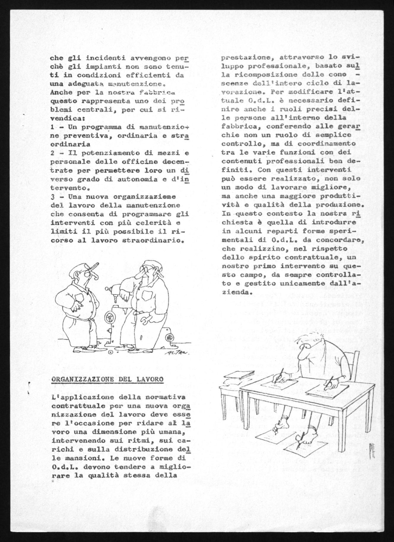 prestazione, attraverso lo sviluppo professionale, basato sul la ricomposizione delle conoscenze dell'intero ciclo di lavorazione. Per modificare l'attuale 0.d.L. è necessario definire anche i ruoli precisi delle persone all'interno della fabbrica, conferendo alle gerar chie non un ruolo dí semplice controllo, ma di coordinamento tra le varie funzioni con dei contenuti professionali ben definiti. Con questi interventi può essere realizzato, non solo un modo di lavorare migliore, ma anche una maggiore produttività e qualità della produzione. In questo contesto la nostra ri chiesta è quella di introdurre in alcuni reparti forme sperimentali di 0.d.L. da concordare, che realizzino, nel rispetto dello spirito contrattuale, un nostro primo intervento su questo campo, da sempre controllato e gestito unicamente dall'azienda.