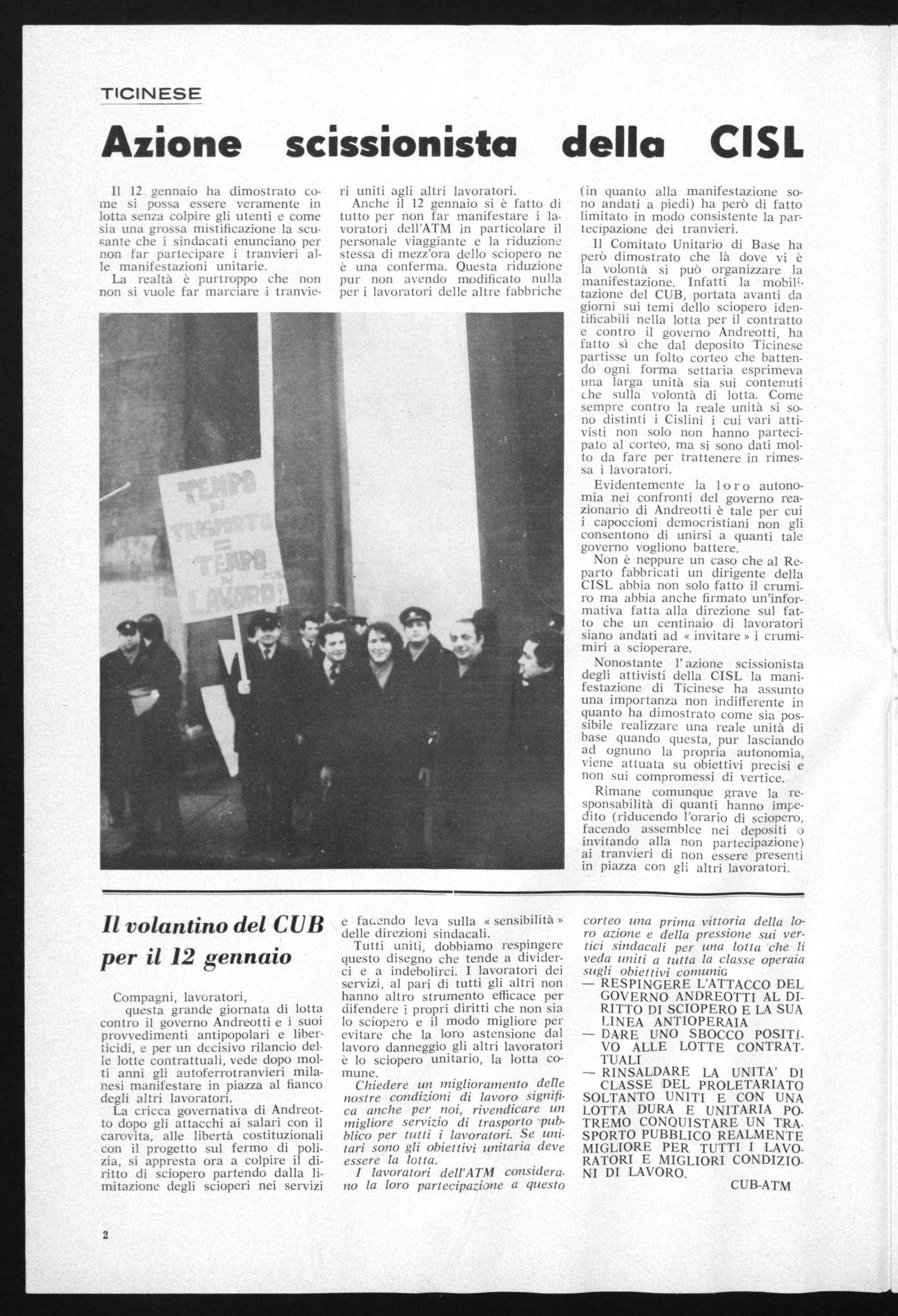 Il Comitato Unitario di Base ha però dimostrato che là dove vi è la volontà si può organizzare la manifestazione. Infatti la mobil;tazione del CUB, portata avanti da giorni sui temi dello sciopero identificabili nella lotta per il contratto contro il governo Andreotti, ha fatto sì che dal deposito Ticinese partisse un folto corteo che battendo ogni forma settaria esprimeva una larga unità sia sui contenuti che sulla volontà di lotta. Come sempre contro la reale unità si sono distinti i Cislini i cui vari attivisti non solo non hanno partecipato al corteo, ma si sono dati molto da fare per trattenere in rimessa i lavoratori.