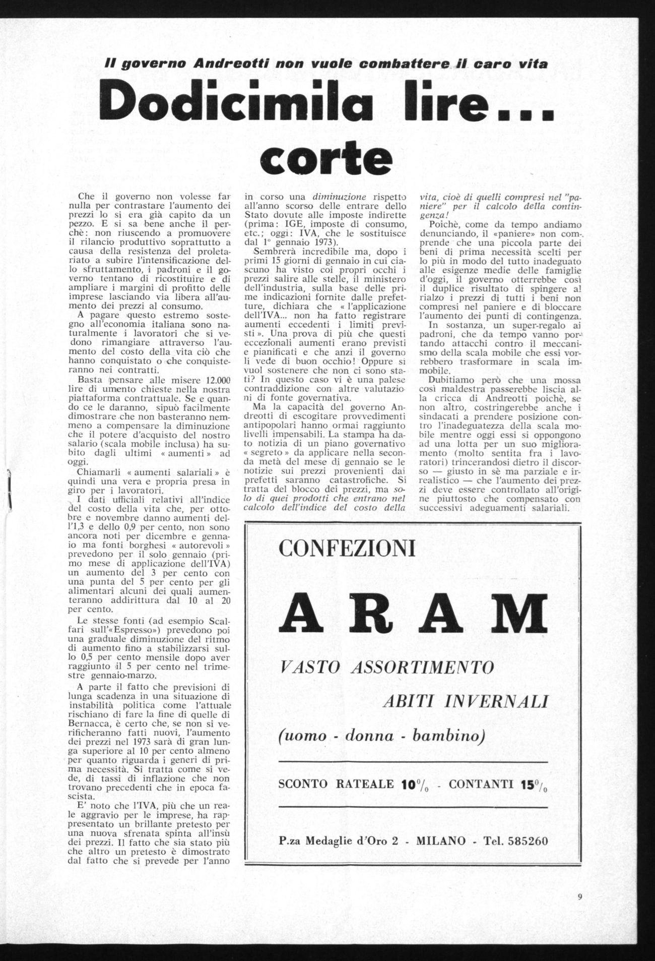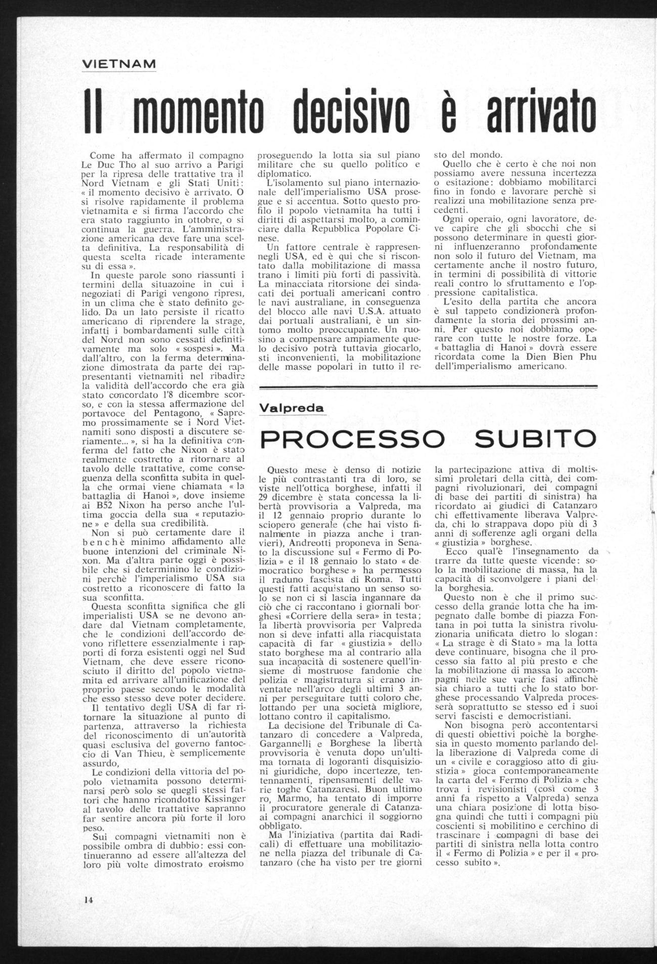 Questo mese è denso di notizie le più contrastanti tra di loro, se viste nell'ottica borghese, infatti il 29 dicembre è stata concessa la libertà provvisoria a Valpreda, ma il 12 gennaio proprio durante lo sciopero generale (che hai visto finalmente in piazza anche i tranvieri), Andreotti proponeva in Senato la discussione sul « Fermo di Polizia » e il 18 gennaio lo stato « democratico borghese » ha permesso il raduno fascista di Roma. Tutti questi fatti acquistano un senso solo se non ci si lascia ingannare da ciò che ci raccontano i giornali borghesi «Corriere della sera» in testa; la libertà provvisoria per Valpreda non si deve infatti alla riacquistata capacità di far « giustizia » dello stato borghese ma al contrario alla sua incapacità di sostenere quell'insieme di mostruose fandonie che polizia e magistratura si erano inventate nell'arco degli ultimi 3 anni per perseguitare tutti coloro che, lottando per una società migliore, lottano contro il capitalismo.