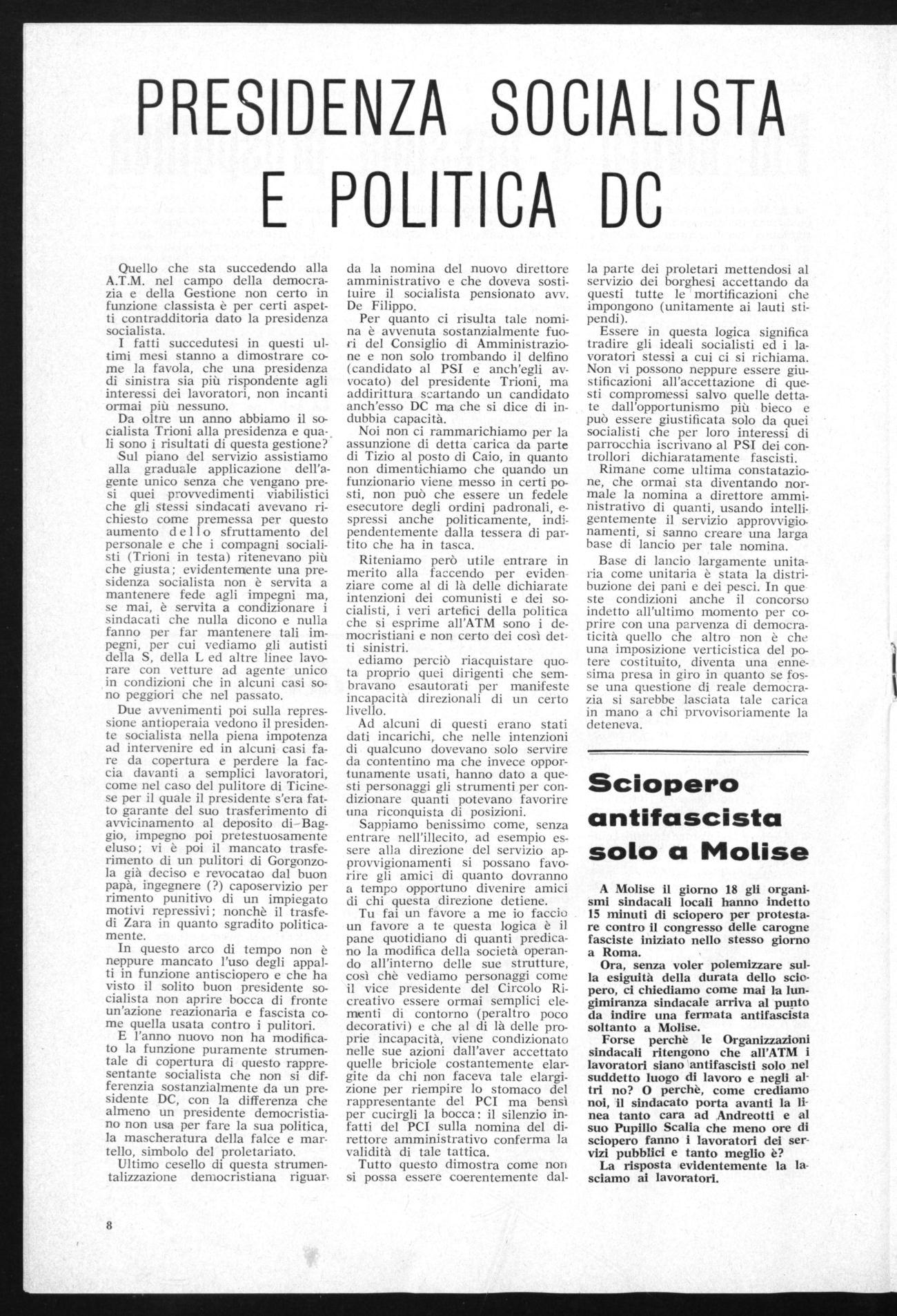 Non vi è dubbio che in un partito autenticamente marxista-leninista un comportamento del genere, da parte di alcuni militanti, verrebbe affrontato con l'espulsione di tali militanti. Ma purtroppo non crediamo ormai più alla befana per cui una gestione autoritaria e verticistica da parte di così detti «compagno» non ci fa meraviglia. A conferma di questo autoritarismo e verticismo basta guardare alle trattative per li contratto, in cui anzichè spingere i tranvieri sul terreno della lotta unitamente agli altri lavoratori con uguali scadenze contrattuali vengono tranquillizzati, tenuti a riposo e isolati nelle lotte (vedi lo sciopero del 22-1-73) esprimendo ed alimentando il corporativismo più gretto così caro alla attuale compagine governativa di centrodestra.