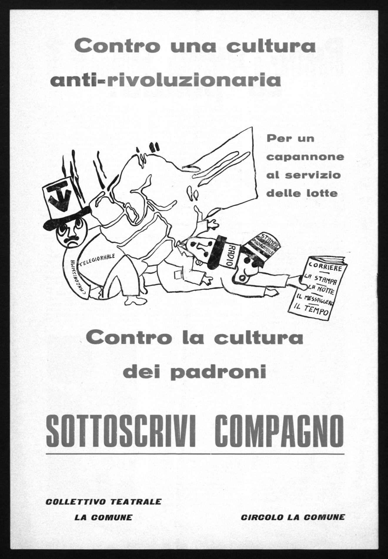 Per questo, non accettare la repressione nei nostri confronti significa soltanto trovare una soluzione concreta che ci permetta di riavere di nuovo a Milano un « capannone ». Ci impediscono di affittarne uno? Bene, proponiamo ai 26 mila soci del circolo « La Comùne » e a tutti i compagni di impegnarsi in una SOTTOSCRIZIONE che ci permetta di acquistarne uno, un « capannone » contro la repressione, un « capannone » contro la cultura del padrone.