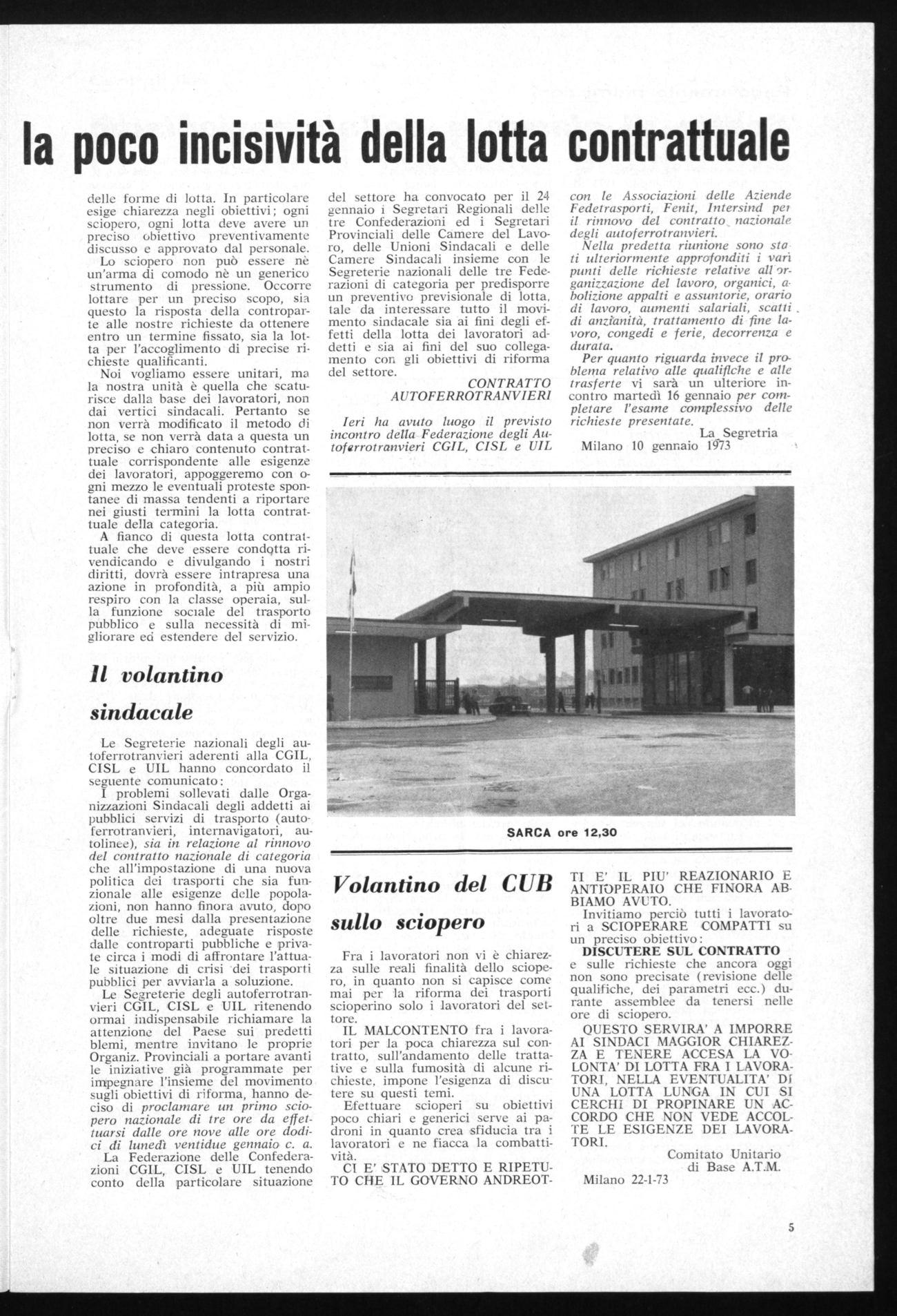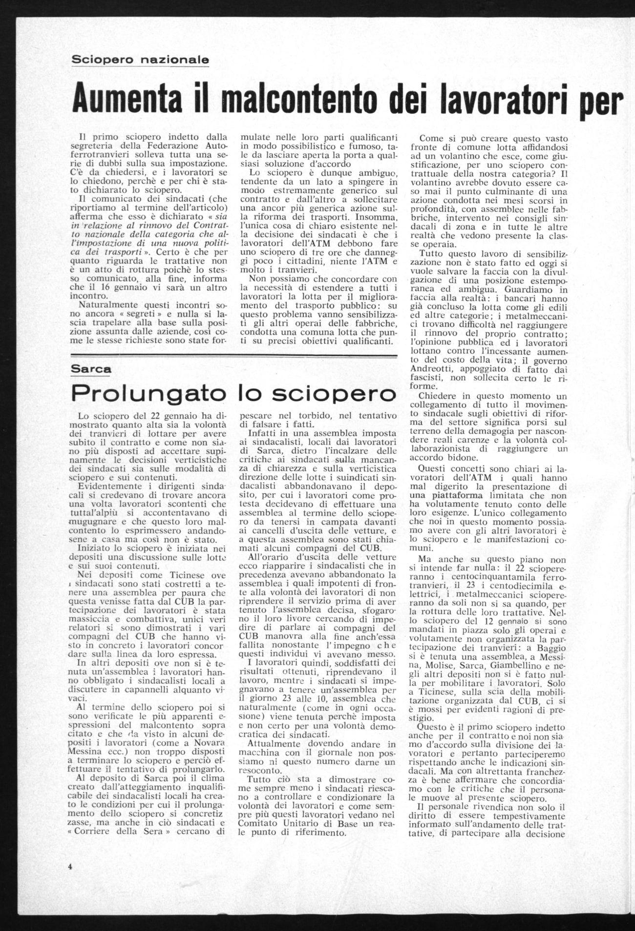 Ma anche su questo piano non si intende far nulla: il 22 sciopereranno i centocinquantamila ferrotranvieri, il 23 i centodiecimila elettrici, i metalmeccanici sciopereranno da soli non si sa quando, per la rottura delle loro trattative. Nello sciopero del 12 gennaio si sono mandati in piazza solo gli operai e volutamente non organizzata la partecipazione dei tranvieri: a Baggio si è tenuta una assemblea, a Messina, Molise, Sarca, Giambellino e negli altri depositi non si è fatto nulla per mobilitare i lavoratori. Solo a Ticinese, sulla scia della mobilitazione organizzata dal CUB, ci si è mossi per evidenti ragioni di prestigio.