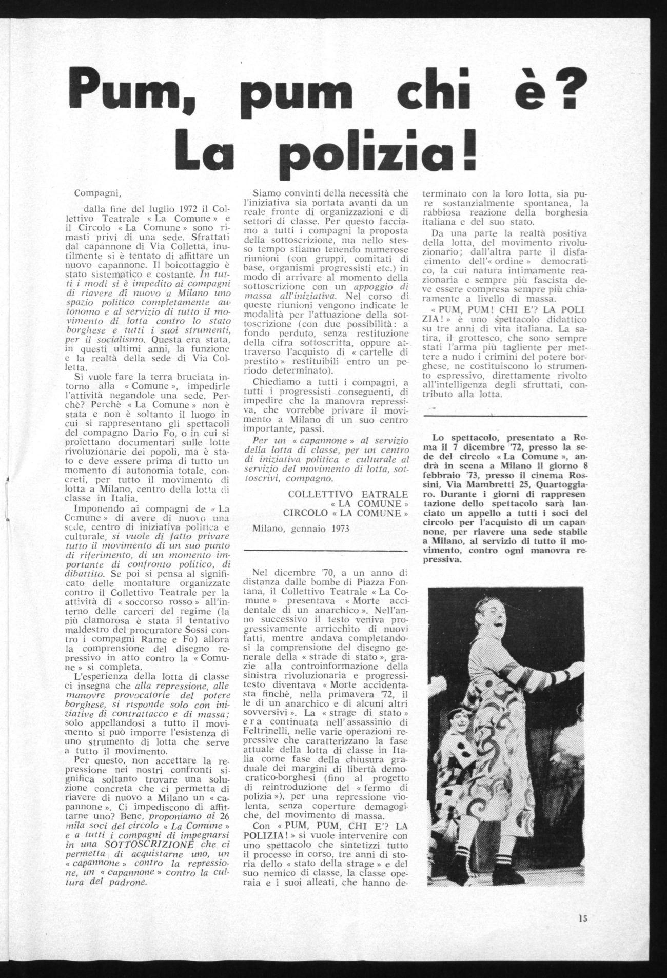 Lo spettacolo, presentato a Roma il 7 dicembre '72, presso la sede del circolo « La Comune », andrà in scena a Milano il giorno 8 febbraio '73, presso il cinema Rossini, Via Mambretti 25, Quartoggiaro. Durante i giorni di rappresen tazione dello spettacolo sarà lan dato un appello a tutti i soci del circolo per l'acquisto di un capan• none, per riavere una sede stabile a Milano, al servizio di tutto il movimento, contro ogni manovra repressiva.