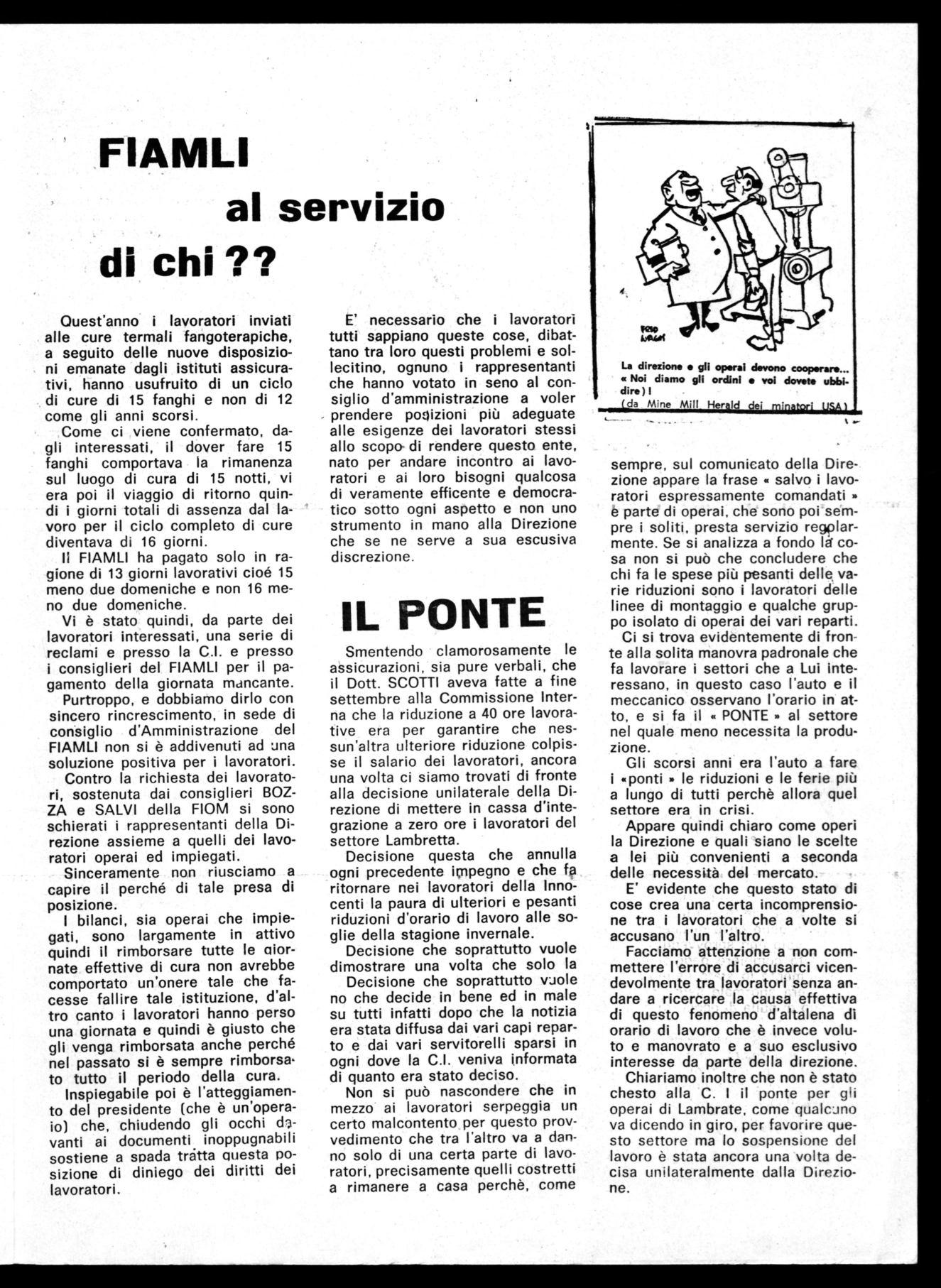 Chiariamo inoltre che non è stato chesto alla C. I il ponte per gii operai di Lambrate, come qualcuno va dicendo in giro, per favorire questo settore ma lo sospensione del lavoro è stata ancora una volta decisa unilateralmente dalla Direzione.