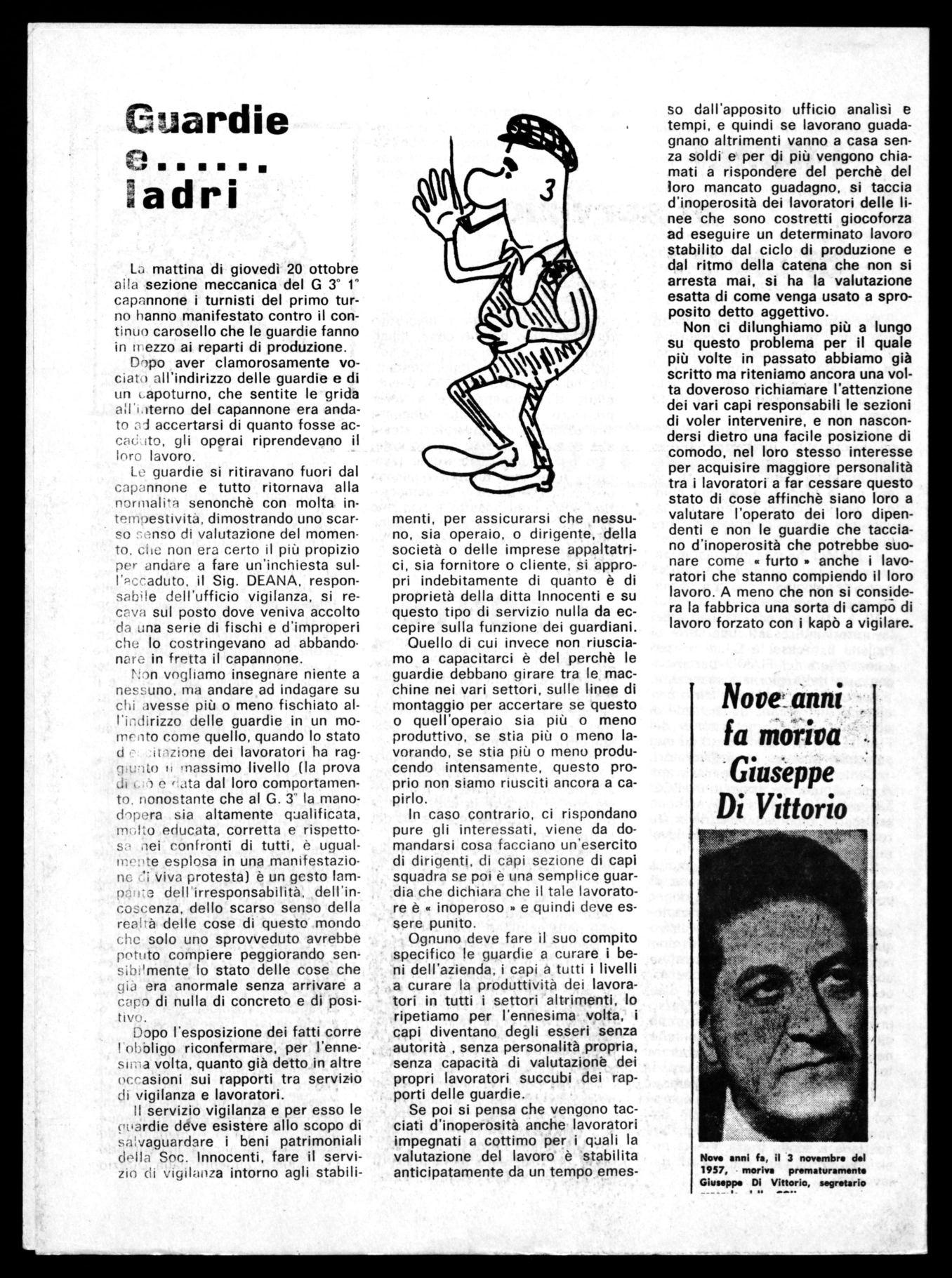 Non ci dilunghiamo più a lungo su questo problema per il quale più volte in passato abbiamo già scritto ma riteniamo ancora una volta doveroso richiamare l'attenzione dei vari capi responsabili le sezioni di voler intervenire, e non nascondersi dietro una facile posizione di comodo, nel loro stesso interesse per acquisire maggiore personalità tra i lavoratori a far cessare questo stato di cose affinchè siano loro a valutare l'operato dei loro dipendenti e non le guardie che tacciano d'inoperosità che potrebbe suonare come « furto » anche i lavoratori che stanno compiendo il loro lavoro. A meno che non si considera la fabbrica una sorta di campà di lavoro forzato con i kapò a vigilare.