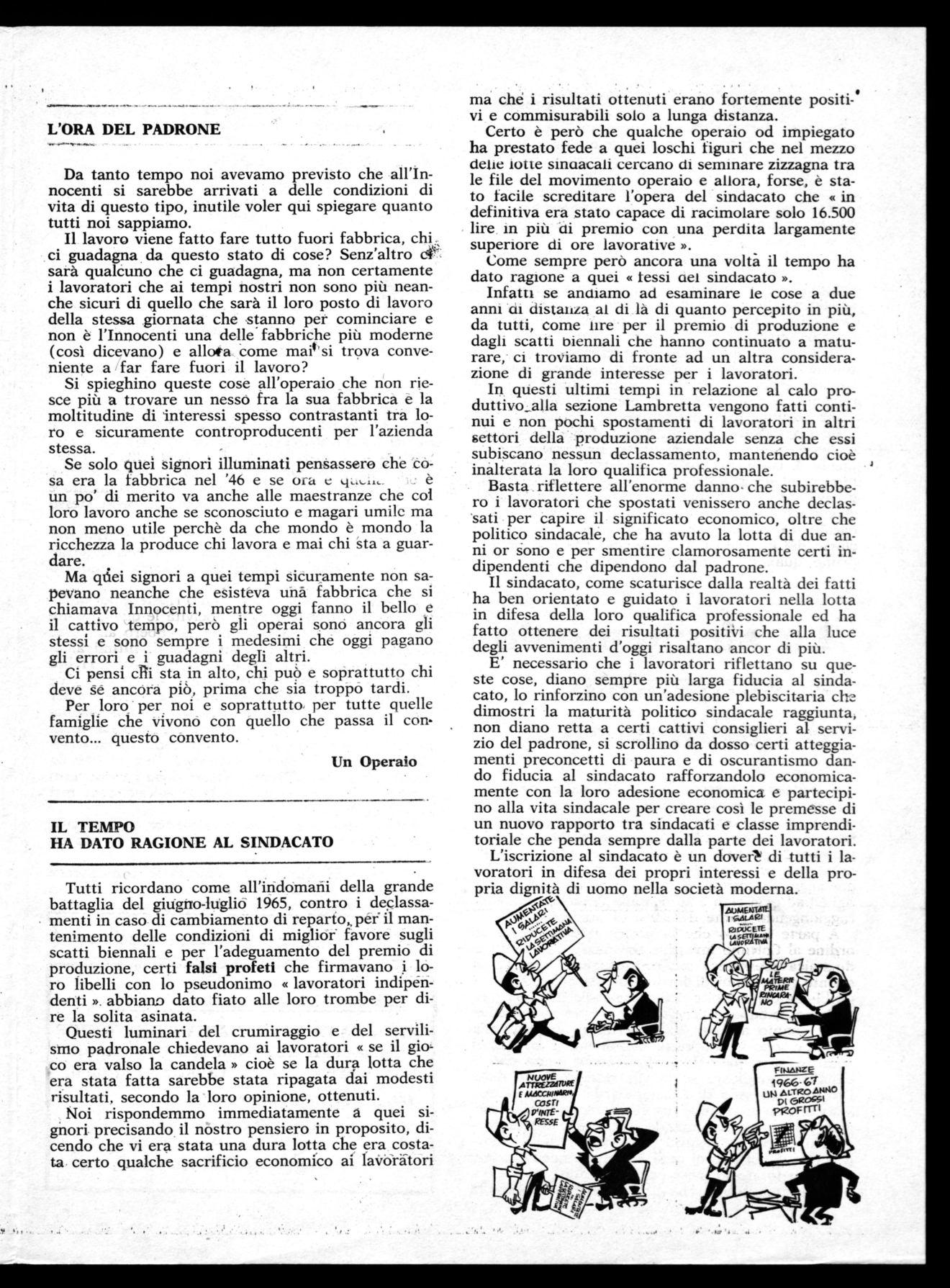 Tutti ricordano come all'indomani della grande battaglia del giugno-luglio 1965, contro i declassamenti in caso di cambiamento di reparto,, per il mantenimento delle condizioni di miglior" favore sugli scatti biennali e per l'adeguamento del premio di produzione, certi falsi profeti che firmavano i loro libelli con lo pseudonimo « lavoratori indipendenti ». abbiano dato fiato alle loro trombe per dire la solita asinata.