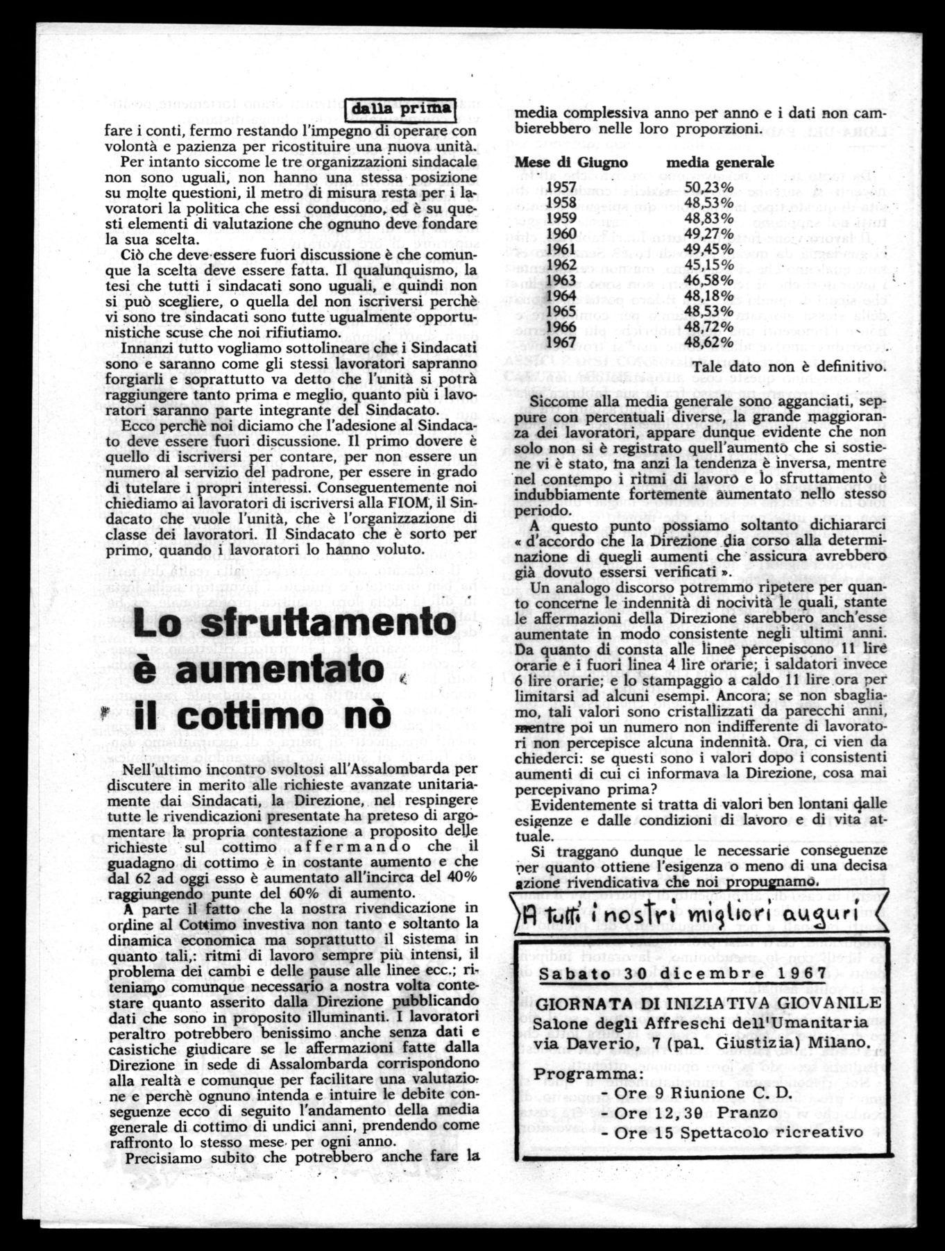 Nell'ultimo incontro svoltosi all'Assalombarda per discutere in merito alle richieste avanzate unitariamente dai Sindacati, la Direzione, nel respingere tutte le rivendicazioni presentate ha preteso di argomentare la propria contestazione a proposito delle richieste sul cottimo a f f e r m a n d o che il guadagno di cottimo è in costante aumento e che dal 62 ad oggi esso è aumentato all'incirca del 40% raggiungendo punte del 60% di aumento.