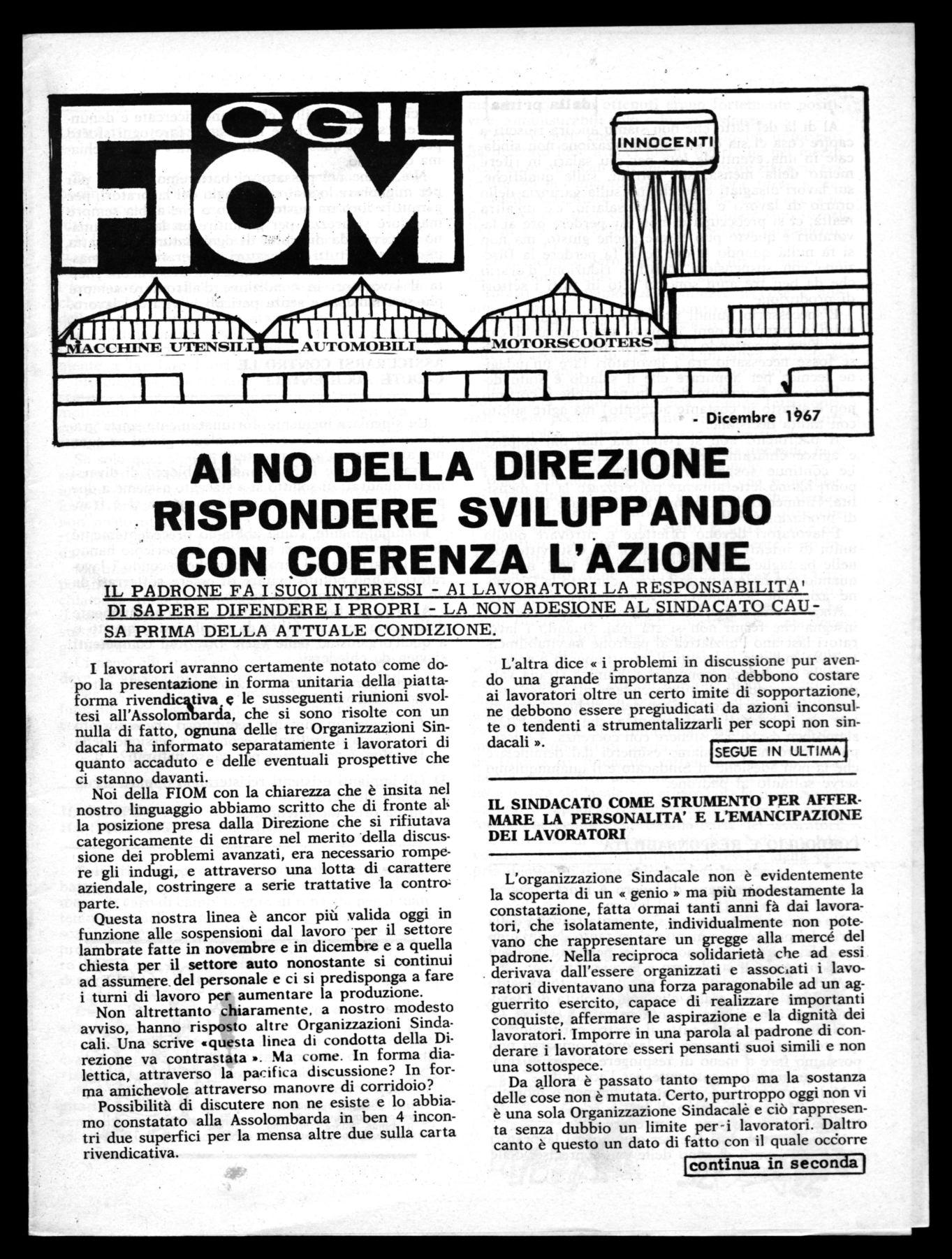 I lavoratori devono riflettere e ritrovare quella unità di intenti e di lotta che li ha visti vittoriosi nelle battaglie aziendali del 1961, nel 1962, nel '65, quando con la loro unità hanno sconfitto la Direzione aziendale e muoversi verso nuove conquiste.