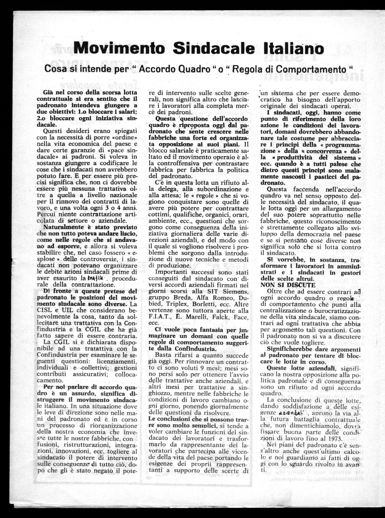 Per noi parlare di accordo quadro è un assurdo, significa distruggere il movimento sindacale italiano. In una situazione dove le leve di direzione sono nelle mani del padronato ed è in corso un processo di riorganizzazione della nostra economia che investe tutte le nostre fabbriche, con fusioni, ristrutturazioni, integrazioni, innovazioni, ecc. togliere al sindacato il potere di intervento sulle conseguenze. di tutto ciò, dopo che gli è stato negato il pote-