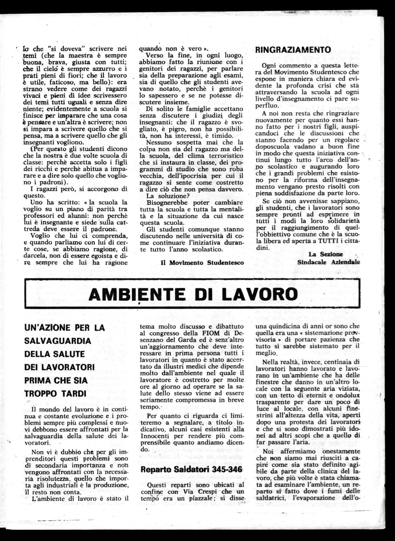 Noi affermiamo onestamente che non siamo mai riusciti a capire come sia stato definito agibile da parte della clinica del lavoro, che più volte è stata chiama. ta ad esaminare l'ambiente, un reparto si fatto dove i fumi delle saldatrici, l'evaporazione dell'o-