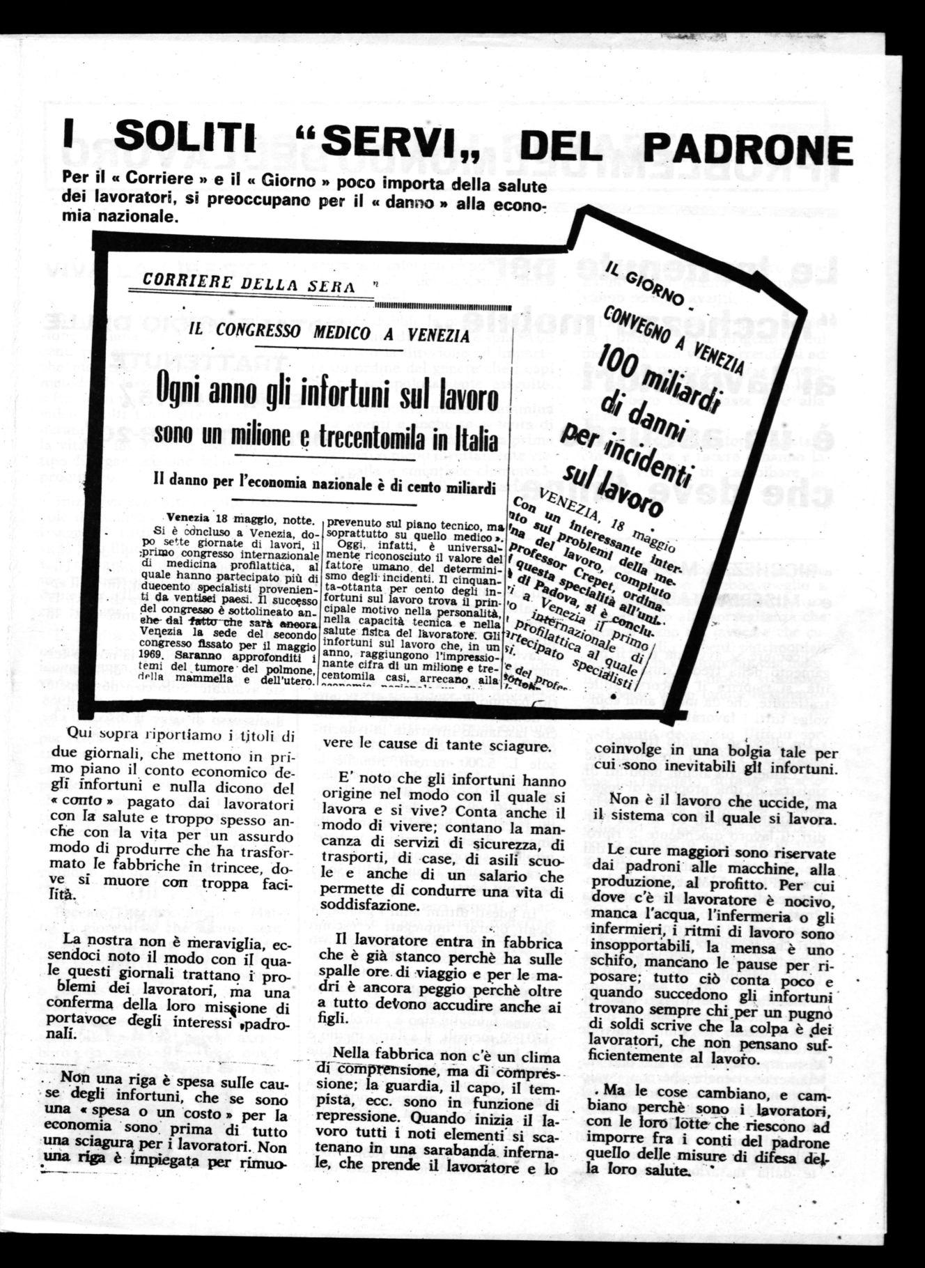 Qui sopra riportiamo i titoli di due giornali, che mettono in primo piano il conto economico degli infortuni e nulla dicono del a conto » pagato dai lavoratori con la salute e troppo spesso anche con la vita per un assurdo modo di produrre che ha trasformato Ie fabbriche in trincee, dove si muore con troppa facilità.