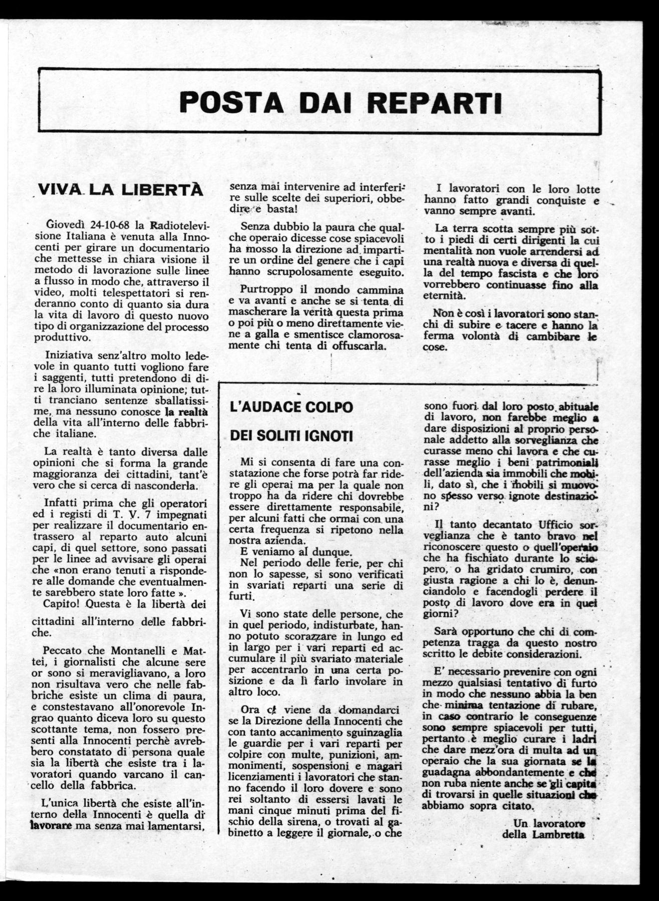 Peccato che Montanelli e Mattei, i giornalisti che alcune sere or sono si meravigliavano, a loro non risultava vero che nelle fabbriche esiste un clima di paura, e constestavano all'onorevole Ingrao quanto diceva loro su questo scottante tema, non fossero presenti alla Innocenti perchè avrebbero constatato di persona quale sia la libertà che esiste tra i lavoratori quando varcano il cancello della fabbrica.