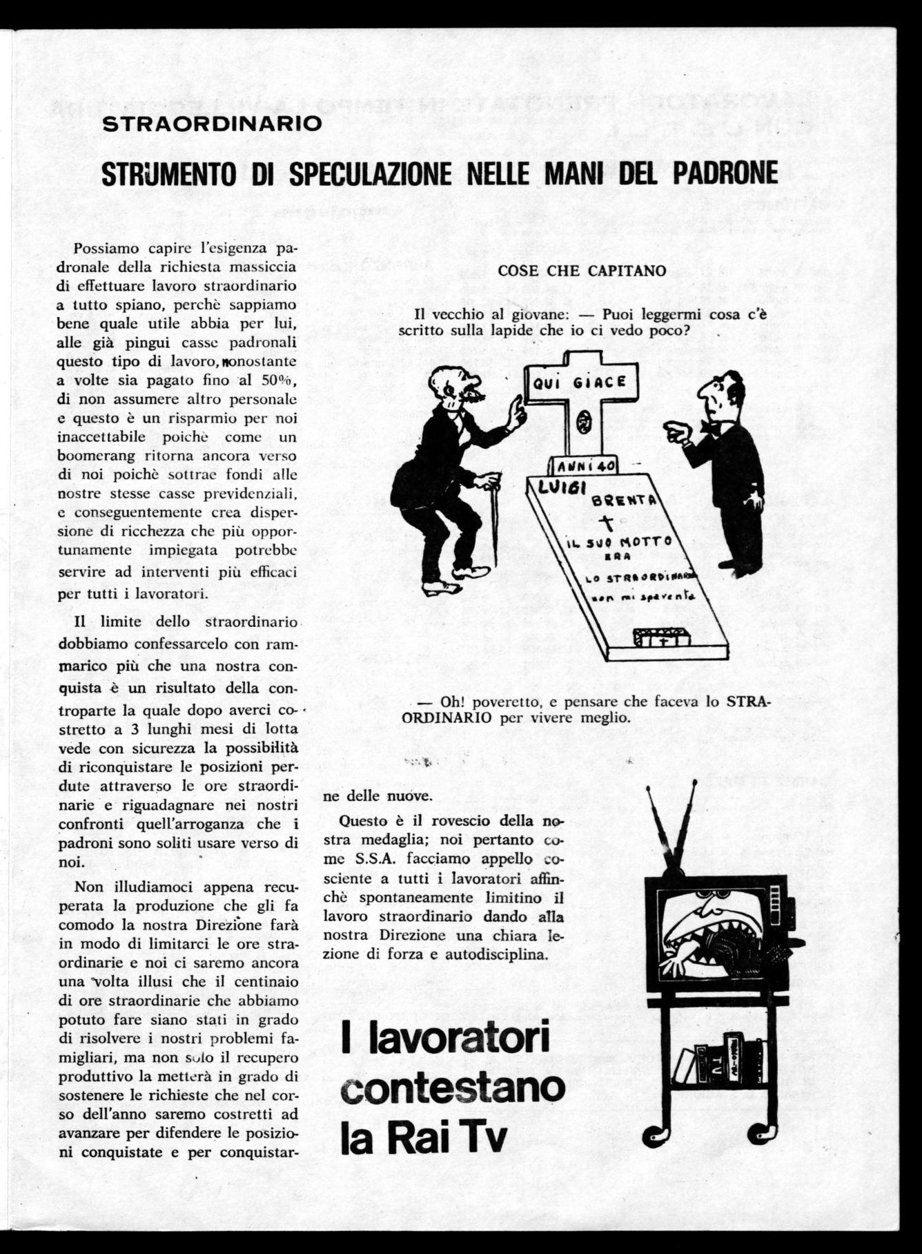 Questo è il rovescio della nostra medaglia; noi pertanto come S.S.A. facciamo appello cosciente a tutti i lavoratori affinchè spontaneamente limitino il lavoro straordinario dando alla nostra Direzione una chiara lezione di forza e autodisciplina.