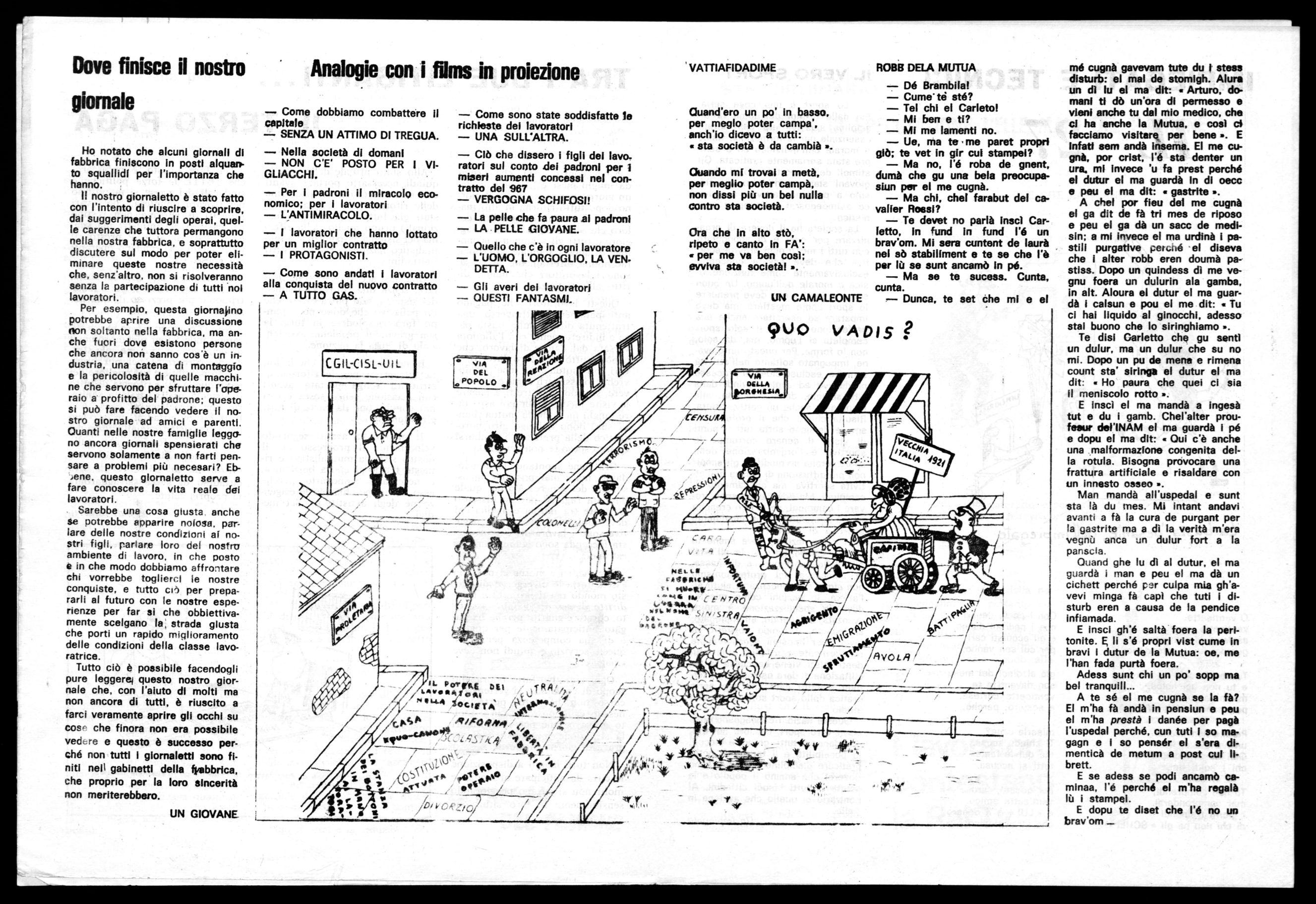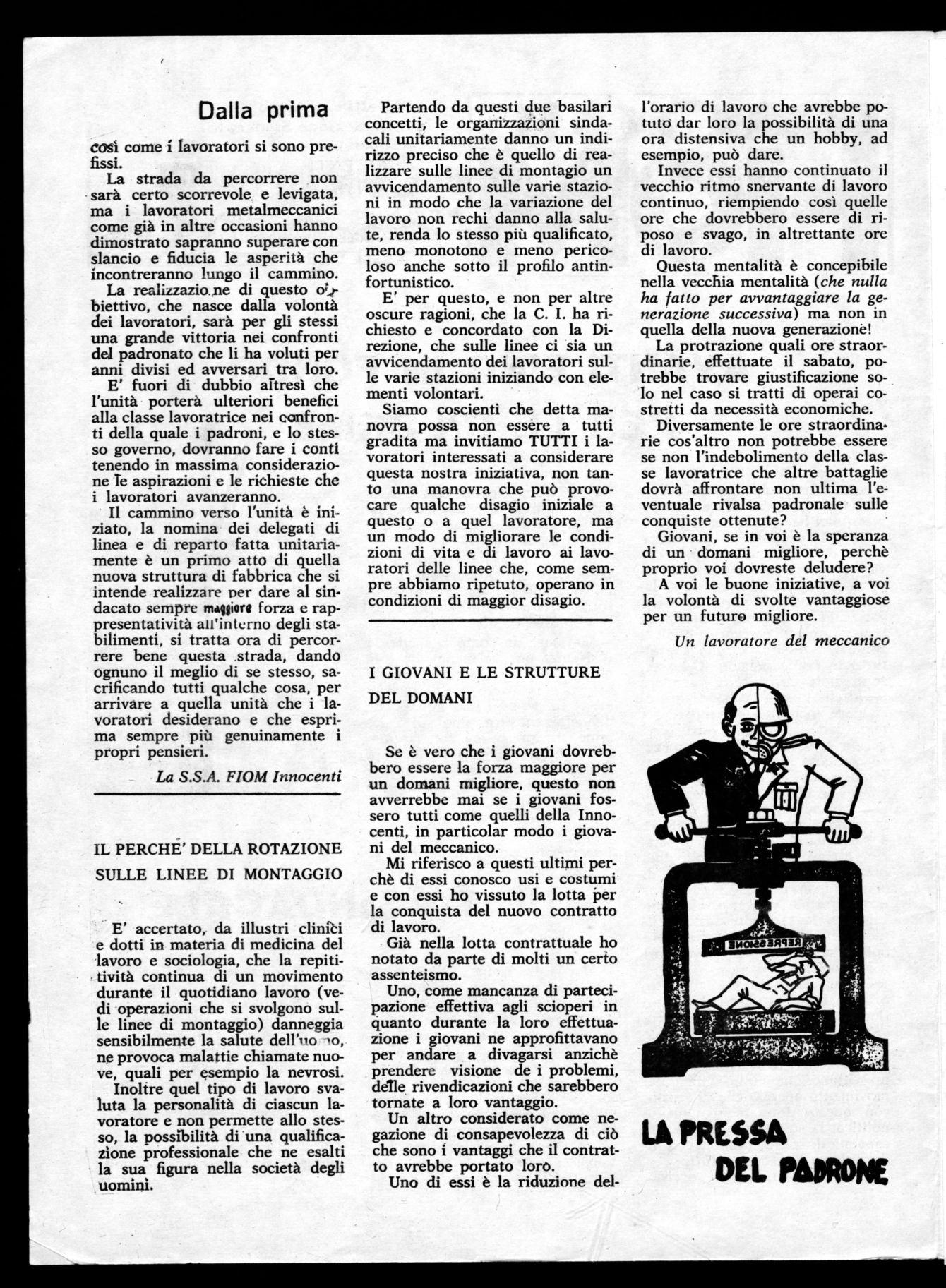 Per esempio, questa giorna'ino potrebbe aprire una discussione non soltanto nella fabbrica, ma anche fuori dove esistono persone che ancora non sanno cos'è un industria, una catena di montaggio la pericolosità di quelle macchine che servono per sfruttare l'operaio a profitto del padrone: questo si può fare facendo vedere il nostro giornale ad amici e parenti. Quanti nelle nostre famiglie leggono ancora giornali spensierati che servono solamente a non farti pensare a problemi più necesari? Eb.ene. questo giornaletto serve a fare conoscere la vita reale dei lavoratori.