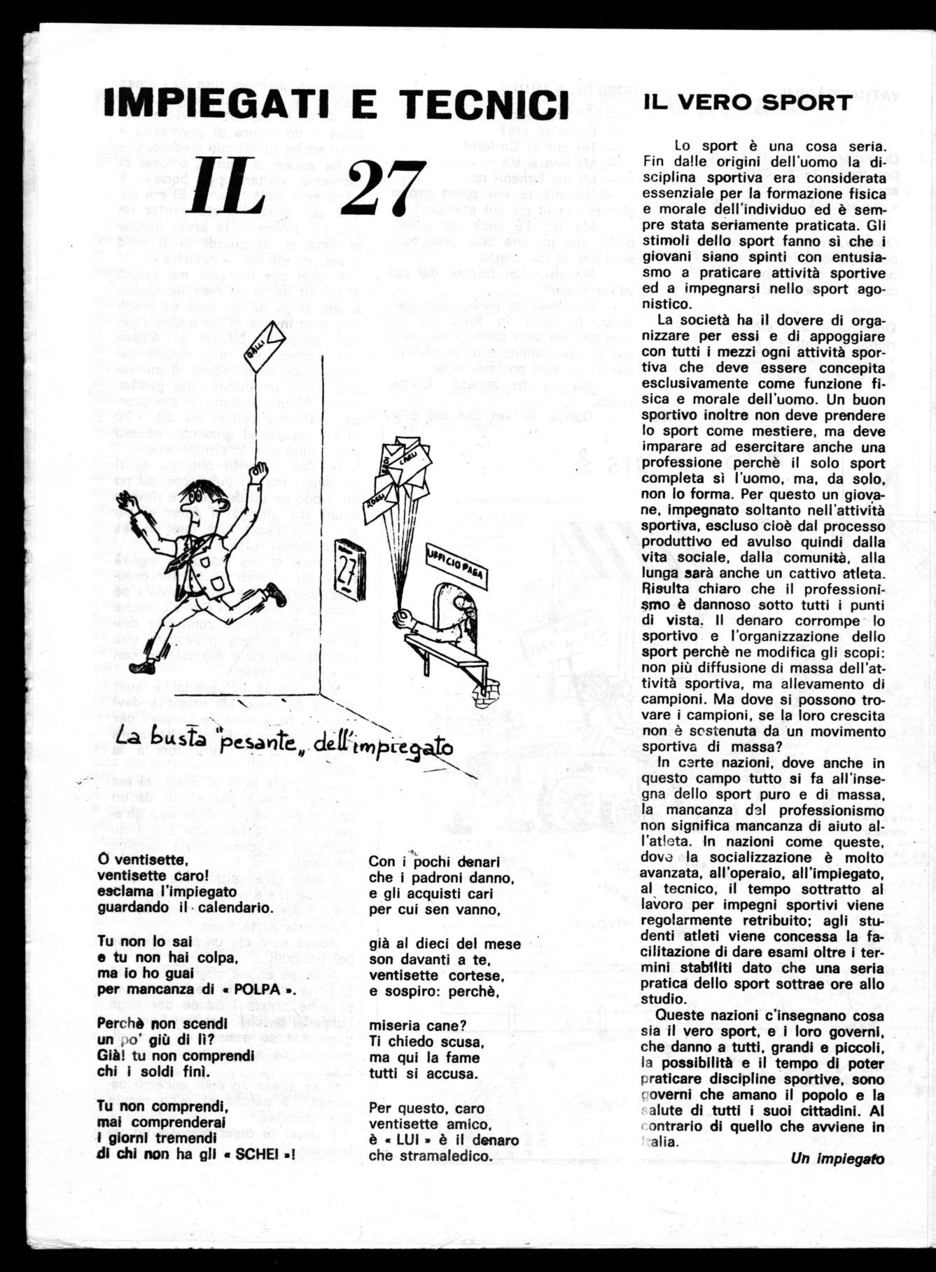 La società ha il dovere di organizzare per essi e di appoggiare con tutti i mezzi ogni attività sportiva che deve essere concepita esclusivamente come funzione fisica e morale dell'uomo. Un buon sportivo inoltre non deve prendere lo sport come mestiere, ma deve imparare ad esercitare anche una professione perchè il solo sport completa sì l'uomo, ma, da solo, non lo forma. Per questo un giovane, impegnato soltanto nell'attività sportiva, escluso cioè dal processo produttivo ed avulso quindi dalla vita sociale, dalla comunità, alla lunga sarà anche un cattivo atleta. Risulta chiaro che il professionismo è dannoso sotto tutti i punti di vista. II denaro corrompe lo sportivo e l'organizzazione dello sport perchè ne modifica gli scopi: non più diffusione di massa dell'attività sportiva, ma allevamento di campioni. Ma dove si possono trovare i campioni, se la loro crescita non è sostenuta da un movimento sportiva di massa?