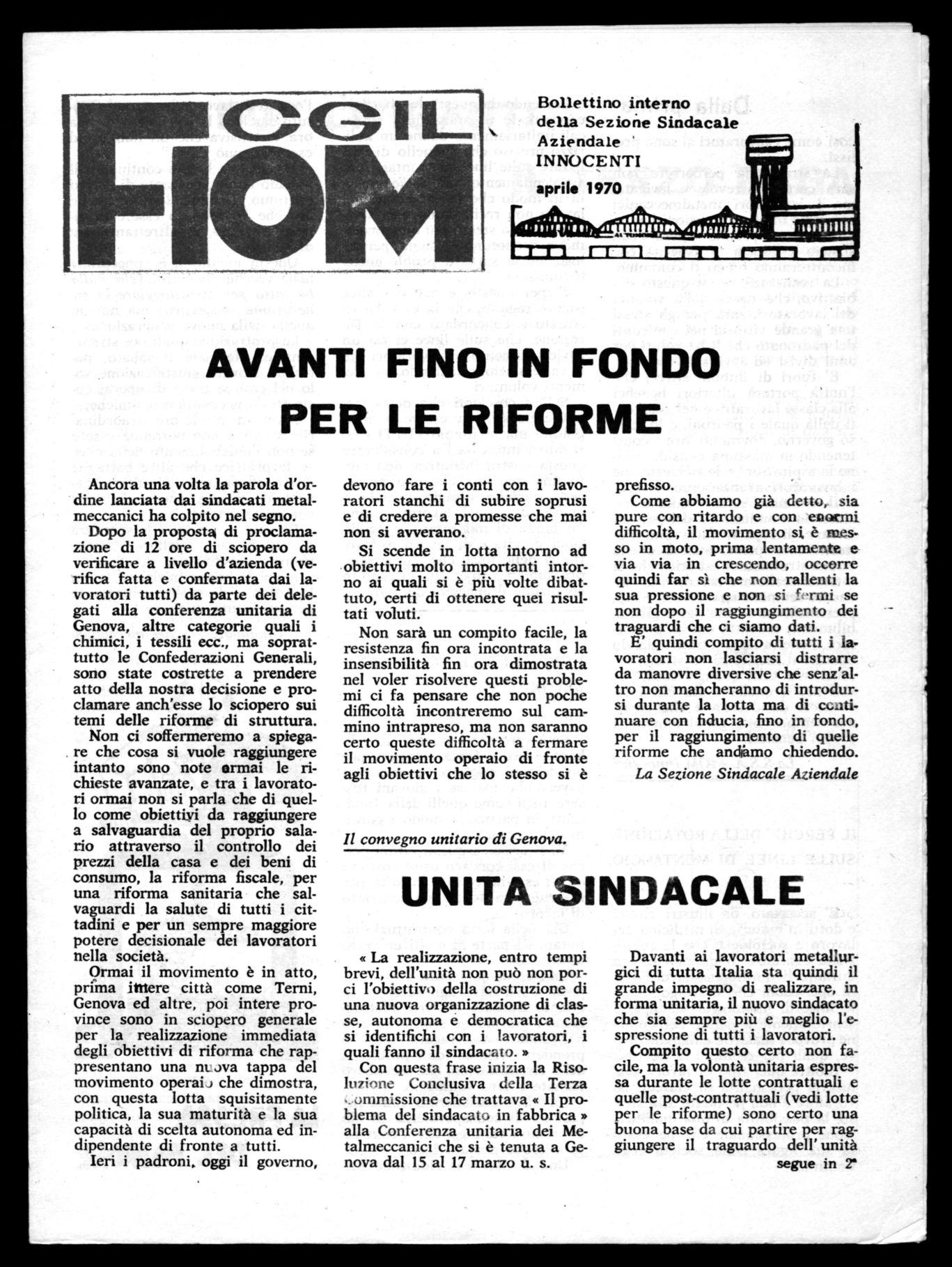 Il cammino verso l'unità è iniziato, la nomina dei delegati di linea e di reparto fatta unitariamente è un primo atto di quella nuova struttura di fabbrica che si intende realizzare per dare al sindacato sempre maggiore forza e rappresentatività all'interno degli stabilimenti, si tratta ora di percorrere bene questa strada, dando ognuno il meglio di se stesso, sacrificando tutti qualche cosa, per arrivare a quella unità che i lavoratori desiderano e che esprima sempre più genuinamente i propri pensieri.