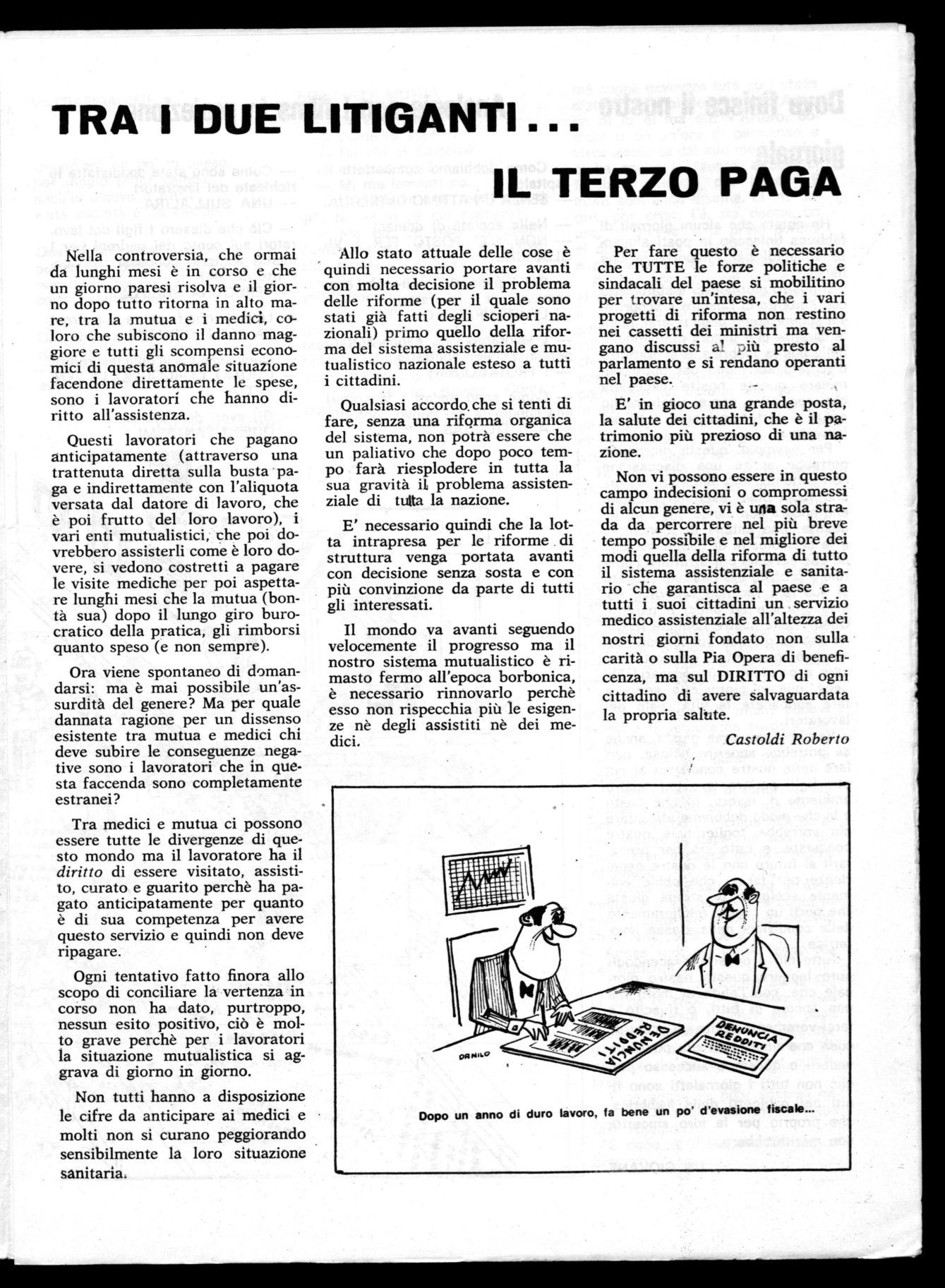 Nella controversia, che ormai da lunghi mesi è in corso e che un giorno paresi risolva e il giorno dopo tutto ritorna in alto mare, tra la mutua e i medici, coloro che subiscono il danno maggiore e tutti gli scompensi economici di questa anomale situazione facendone direttamente le spese, sono i lavoratori che hanno diritto all'assistenza.
