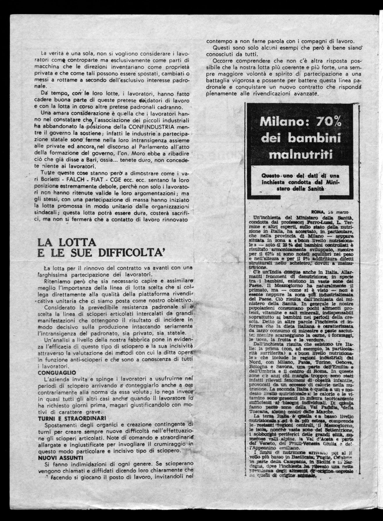 Tutte queste cose stanno pere/ a dimostrare come i vari Borletti - FALCH FIAT - CGE ecc. ecc. sentano la loro posizione estremamente debole, perchè non solo i lavoratori non hanno ritenute valide le loro argomentazioni ;ma gli stessi, con una partecipazione di massa hanno iniziato la lotta promossa in modo unitario dalle organizzazioni sindacali; questa lotta potrà essere dura, costerà sacrifici, ma non si fermerà che a contatto di lavoro rinnovato