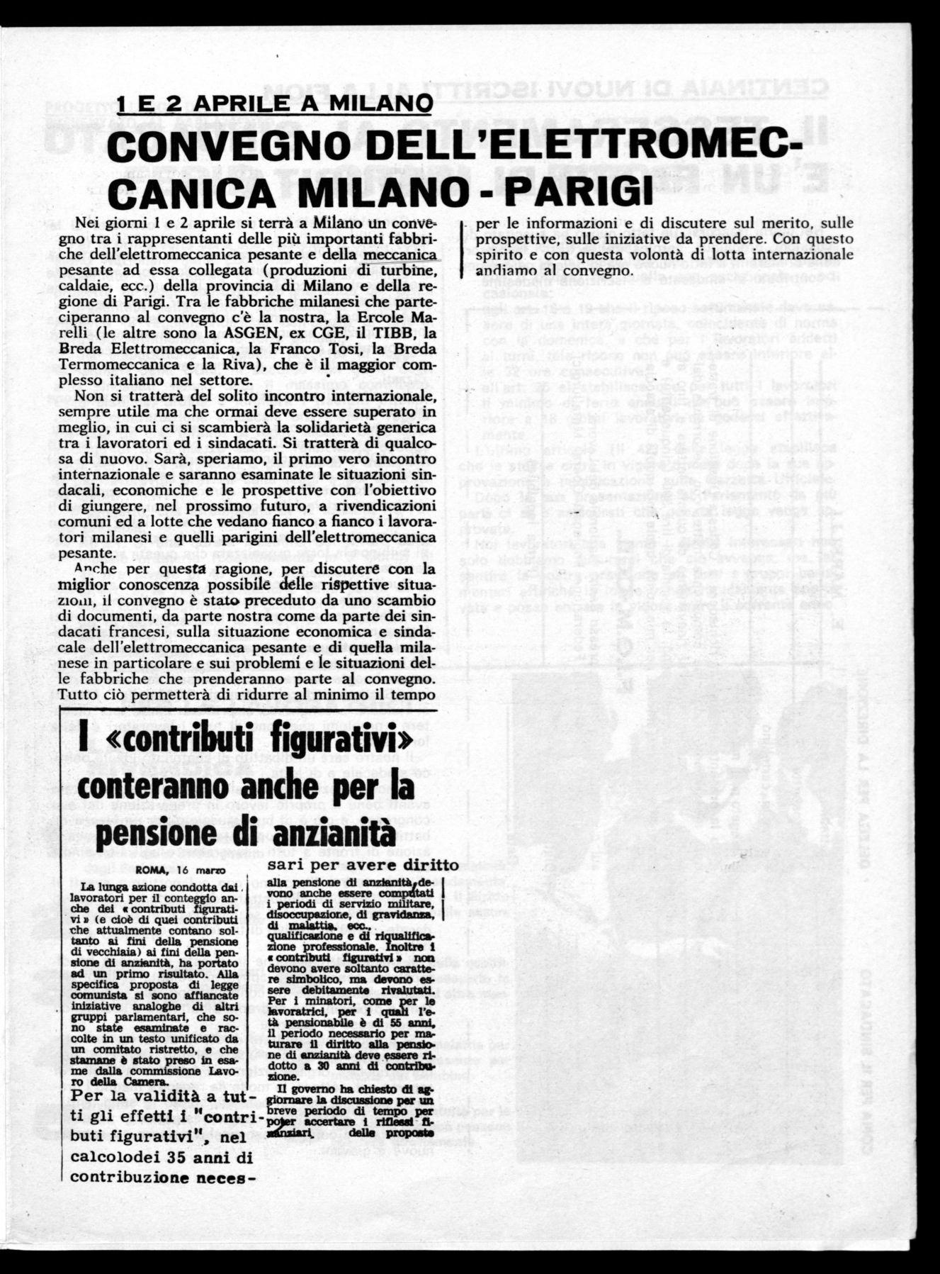 Nei giorni I e 2 aprile si terrà a Milano un conve gno tra i rappresentanti delle più importanti fabbriche dell'elettromeccanica pesante e della meccanica pesante ad essa collegata (produzioni dì turbine, caldaie, ecc.) della provincia di Milano e della regione di Parigi. Tra le fabbriche milanesi che parteciperanno al convegno c'è la nostra, la Ercole Marelli (le altre sono la ASGEN, ex CGE, il TIBB, la Breda Elettromeccanica, la Franco Tosi, la Breda Termomeccanica e la Riva), che è il maggior complesso italiano nel settore.