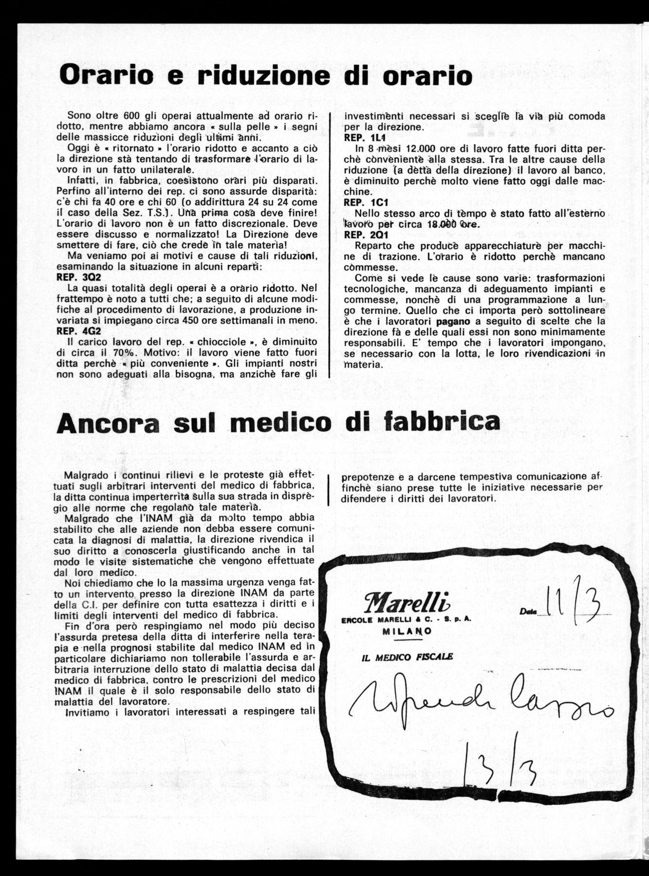 ERCOLE MARELLI I C. - S. p. A. MILANO IL MEDICO FISCALEESponiamo di seguito alcuni punti riguardanti la situazione aziendale che saranno alla base del congresso aziendale della FIOM per elaborare una opportuna piattaforma rivendicativa.