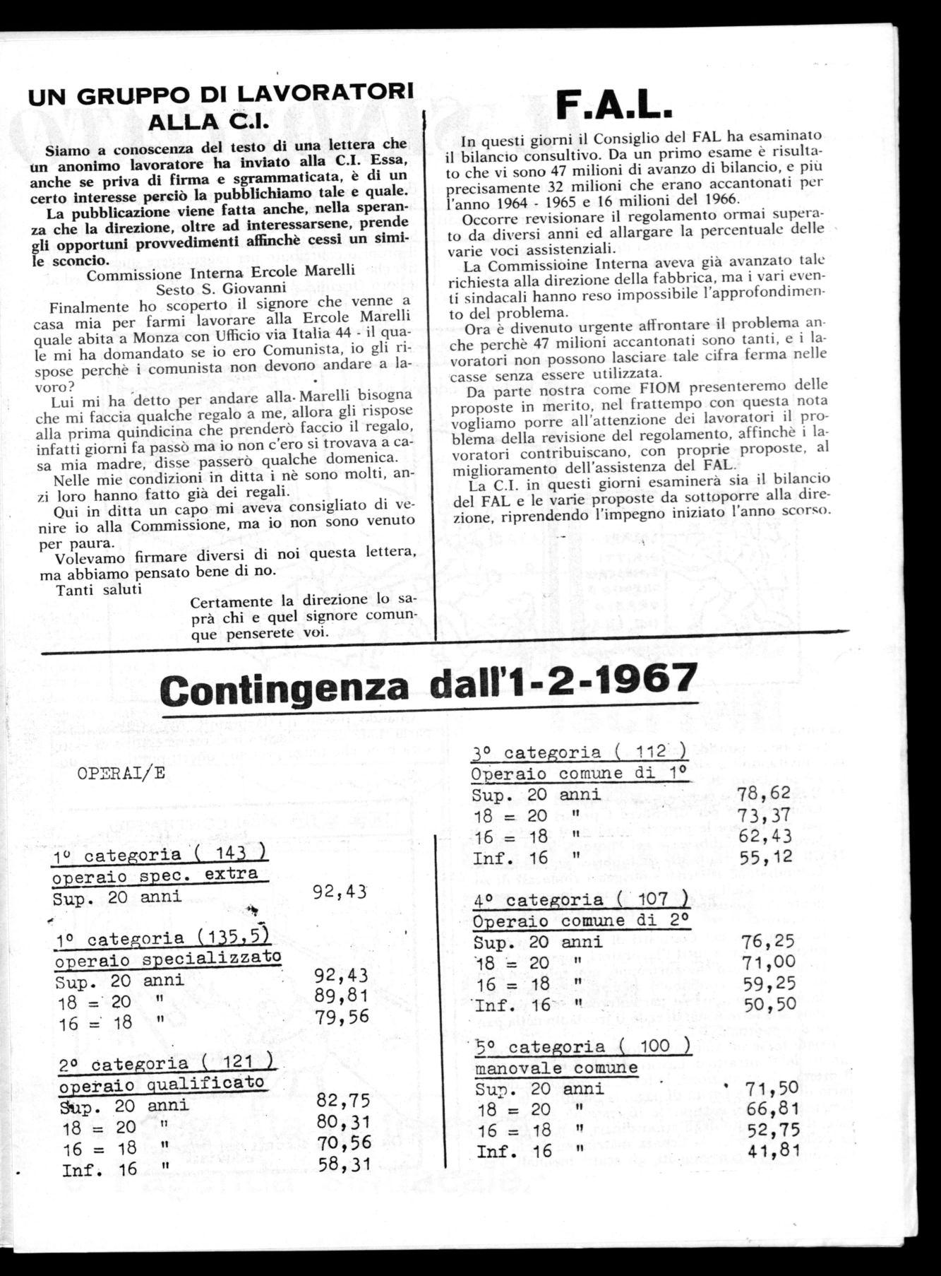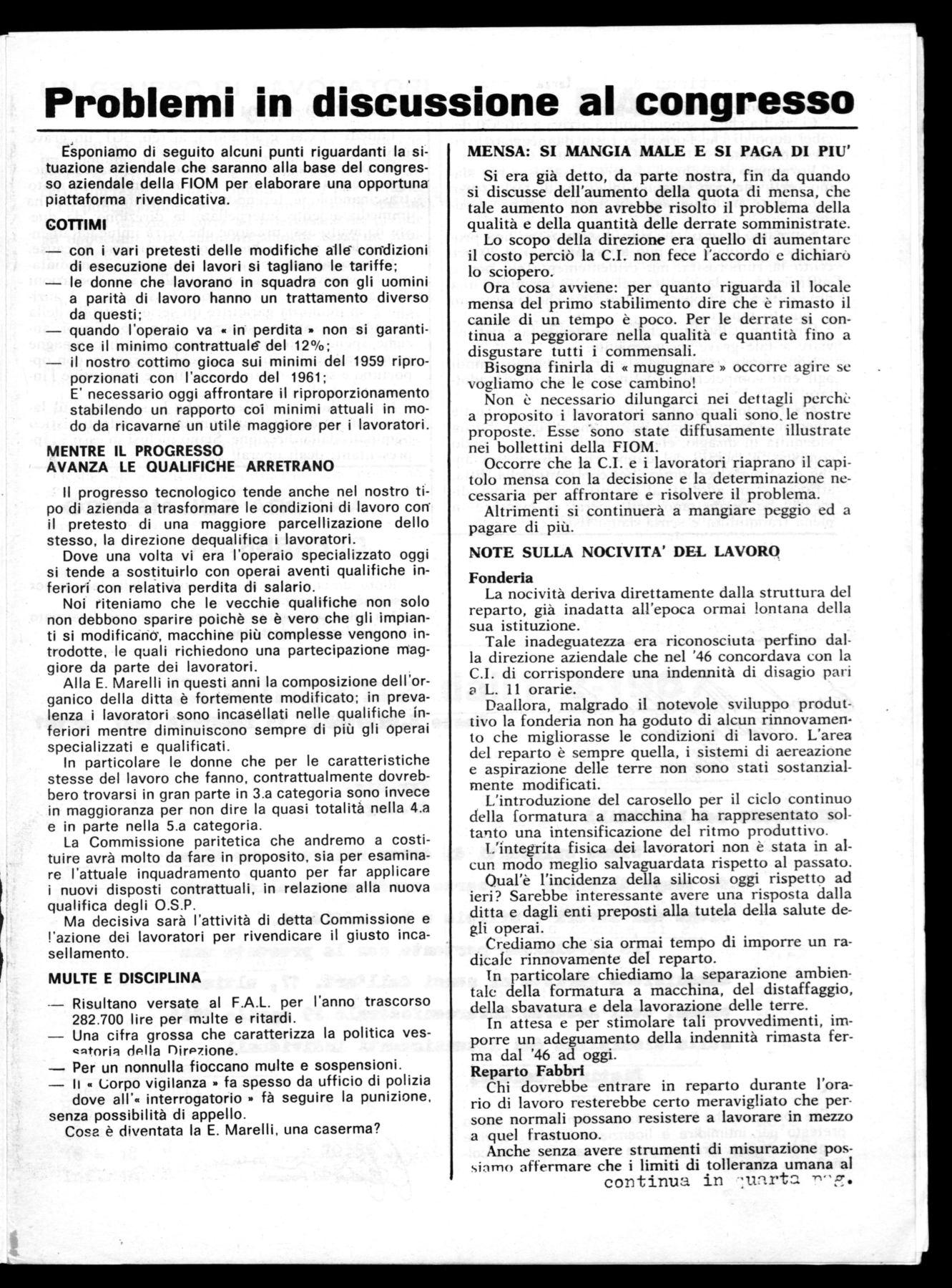 Dopo la lunga e dura battaglia per la conquista del nuovo contratto gli operai e i lavoratori della E. Marelli hanno di fronte una nuova situazione sindacale. Primeggia fra i compiti immediati, la giusta e piena applicazione del contratto conquistato, soprattutto per quanto concerne i nuovi istituti riguardanti i cottimi, l'orario di lavoro, le qualifiche e le nocività di alcune lavorazioni. Tali istituti rappresentano la riaffermazione di quella linea, scelta da tutte le organizzazioni sindacali, che si chiama contrattazione articolata aziendale. Il proposito di tale scelta è evidentissimo: contrattare, nella fabbrica, importantissimi aspetti del rapporto di lavoro con l'intento di tutelare più efficacemente gli interessi dei lavoratori collocandoci nel vivo del processo produttivo aziendale.