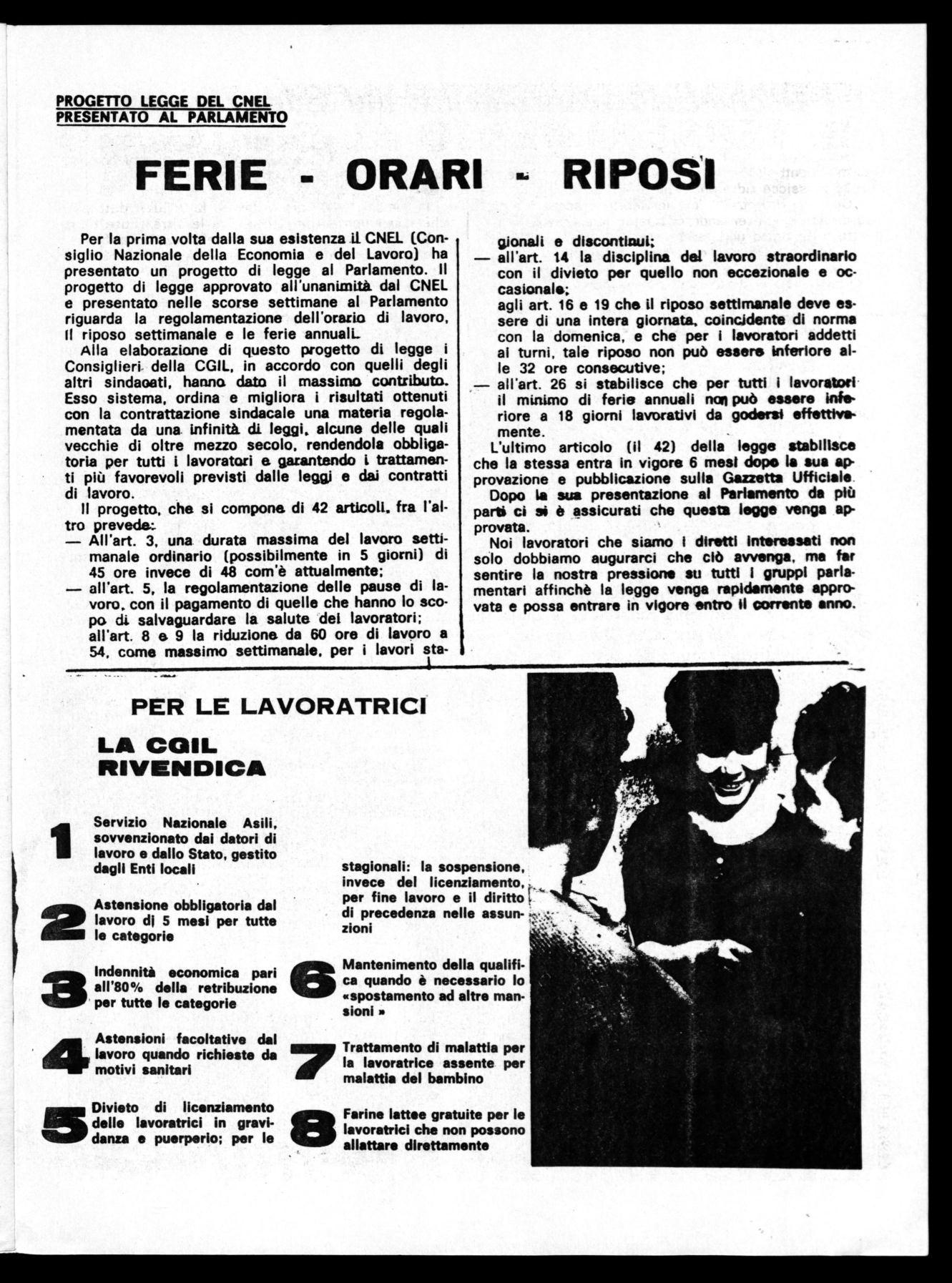 Per la prima volta dalla sua esistenza il CNEL (Consiglio Nazionale della Economia e del Lavoro) ha presentato un progetto di legge al Parlamento. Il progetto di legge approvato all'unanimità dal CNEL e presentato nelle scorse settimane al Parlamento riguarda la regolamentazione dell'oraria di lavoro, Il riposo settimanale e le ferie annuali_