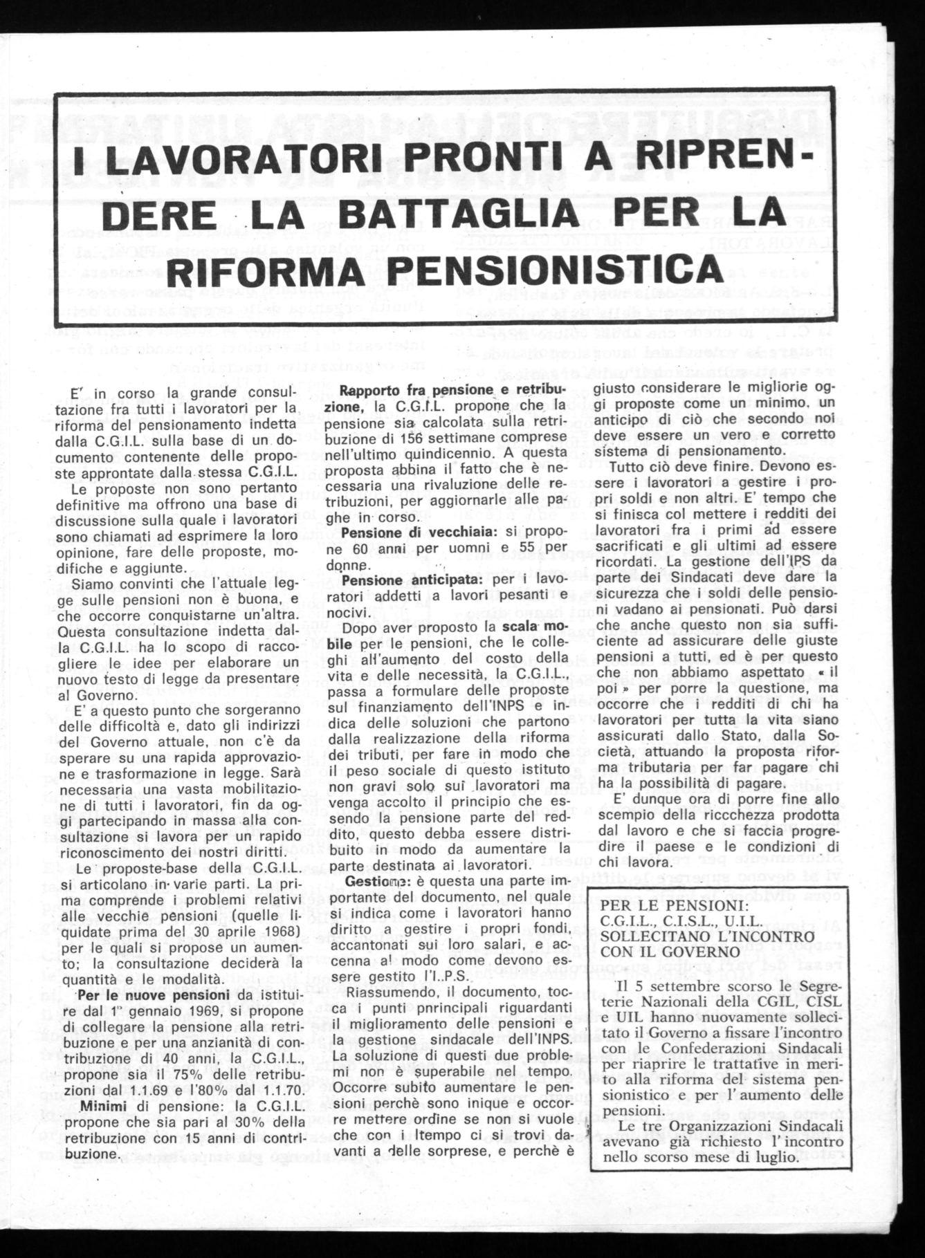 Per le nuove pensioni da istituire dal 1" gennaio 1969, si propone di collegare la pensione alla retribuzione e per una anzianità di contribuzione di 40 anni, la C.G.I.L., propone sia il 75% delle retribuzioni dal 1.1.69 e 1'80% dal 1.1.70.