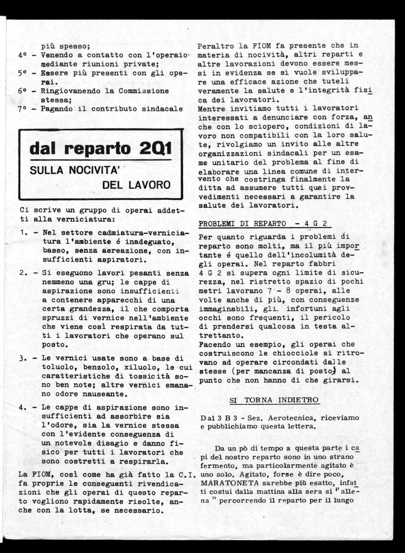 Mentre invitiamo tutti i lavoratori interessati a denunciare con forza, an che con lo sciopero, condizioni di lavoro non compatibili con la loro salute, rivolgiamo un invito alle altre organizzazioni sindacali per un esame unitario del problema al fine di elaborare una linea comune di intervento che costringa finalmente la ditta ad assumere tutti quei provvedimenti necessari a garantire la salute dei lavoratori.