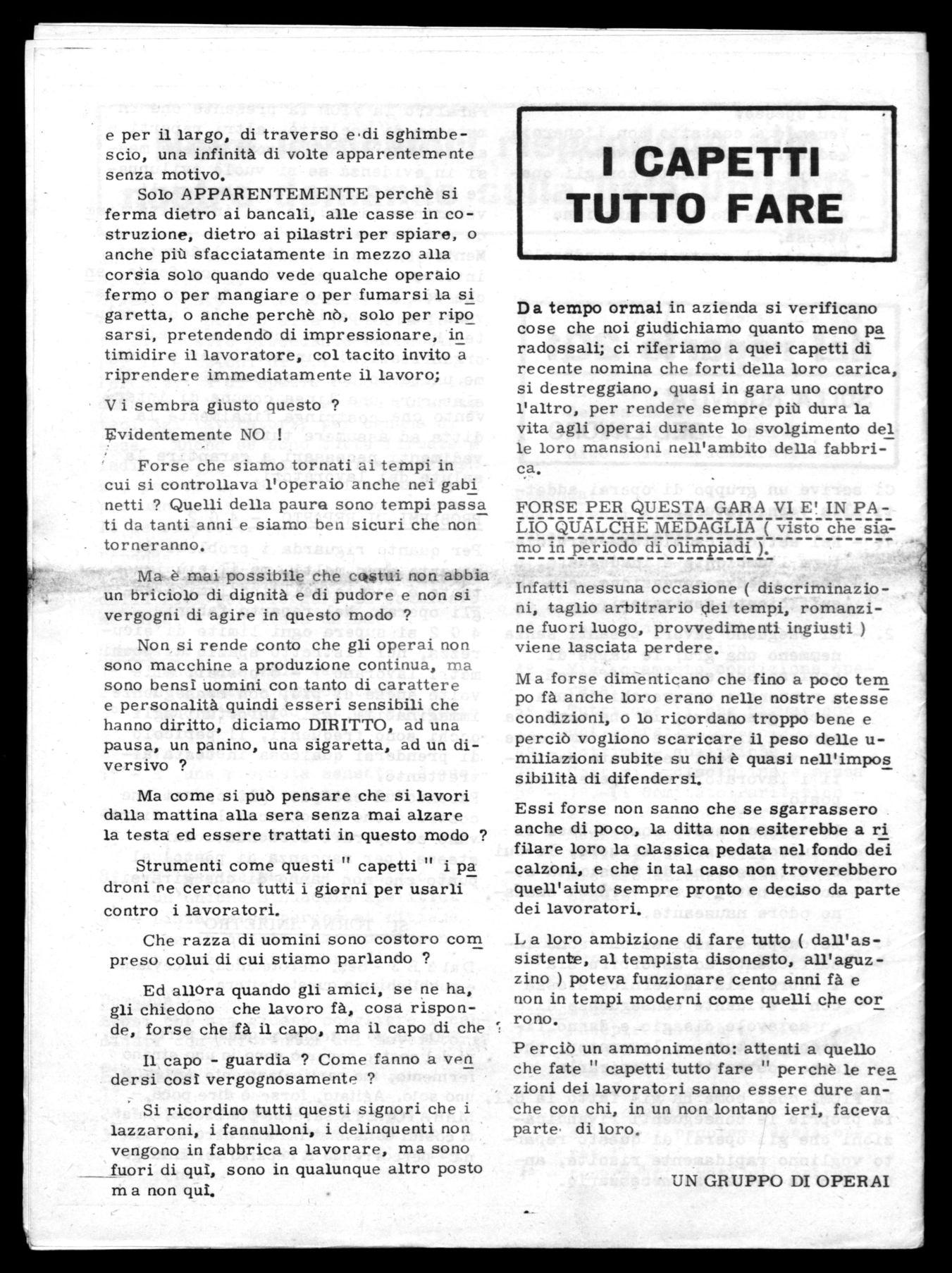 D a tempo ormai in azienda si verificano cose che noi giudichiamo quanto meno pa radossali; ci riferiamo a quei capetti di recente nomina che forti della loro carica, si destreggiano, quasi in gara uno contro l'altro, per rendere sempre più dura la vita agli operai durante lo svolgimento del le loro mansioni nell'ambito della fabbrica.
