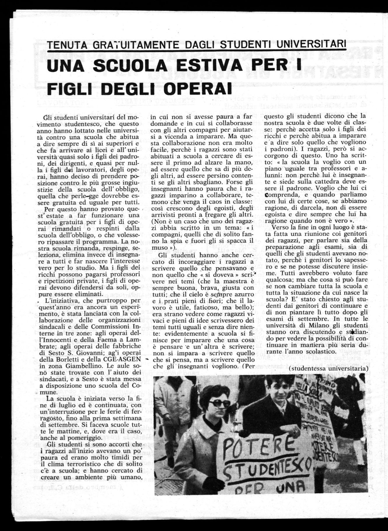 Per questo hanno provato quest' estate a far funzionare una scuola gratuita per i figli di operai rimandati o respinti dalla scuola dell'obbligo, o che volessero ripassare il programma. La nostra scuola rimanda, respinge, seleziona, elimina invece di insegnare a tutti e far nascere l'interesse vero per lo studio. Ma i figli deí ricchi possono pagarsi professori e ripetizioni private, i figli di operai devono difendersi da soli, oppure essere eliminati. . L'iniziativa, che purtroppo per quest'anno era ancora un esperimento, è stata lanciata con la collaborazione delle organizzazioni sindacali e delle Commissioni Interne in tre zone: agli operai dell'Innocenti e della Faema a Lambrate; agli operai delle fabbriche di Sesto S. Giovanni; ag'i operai della Borletti e della CGE-ASGEN in zona Giambellino. Le aule sonó state trovate con 1' aiuto dei sindacati, e a Sesto è stata messa a disposizione uno scuola del Comune.