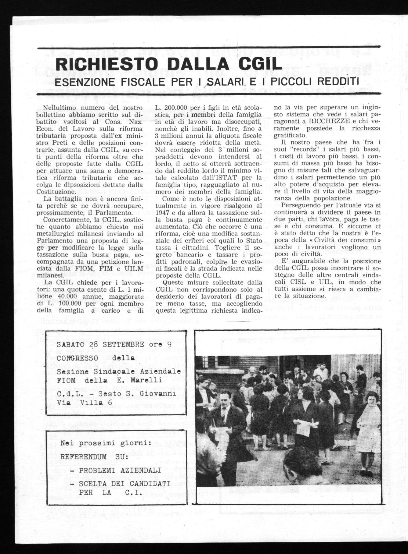 La CGIL chiede per i lavoratori: una quota esente di L. 1 milione 40.000 annue, maggiorate di L. 100.000 per ogni membro della famiglia a carico e di
