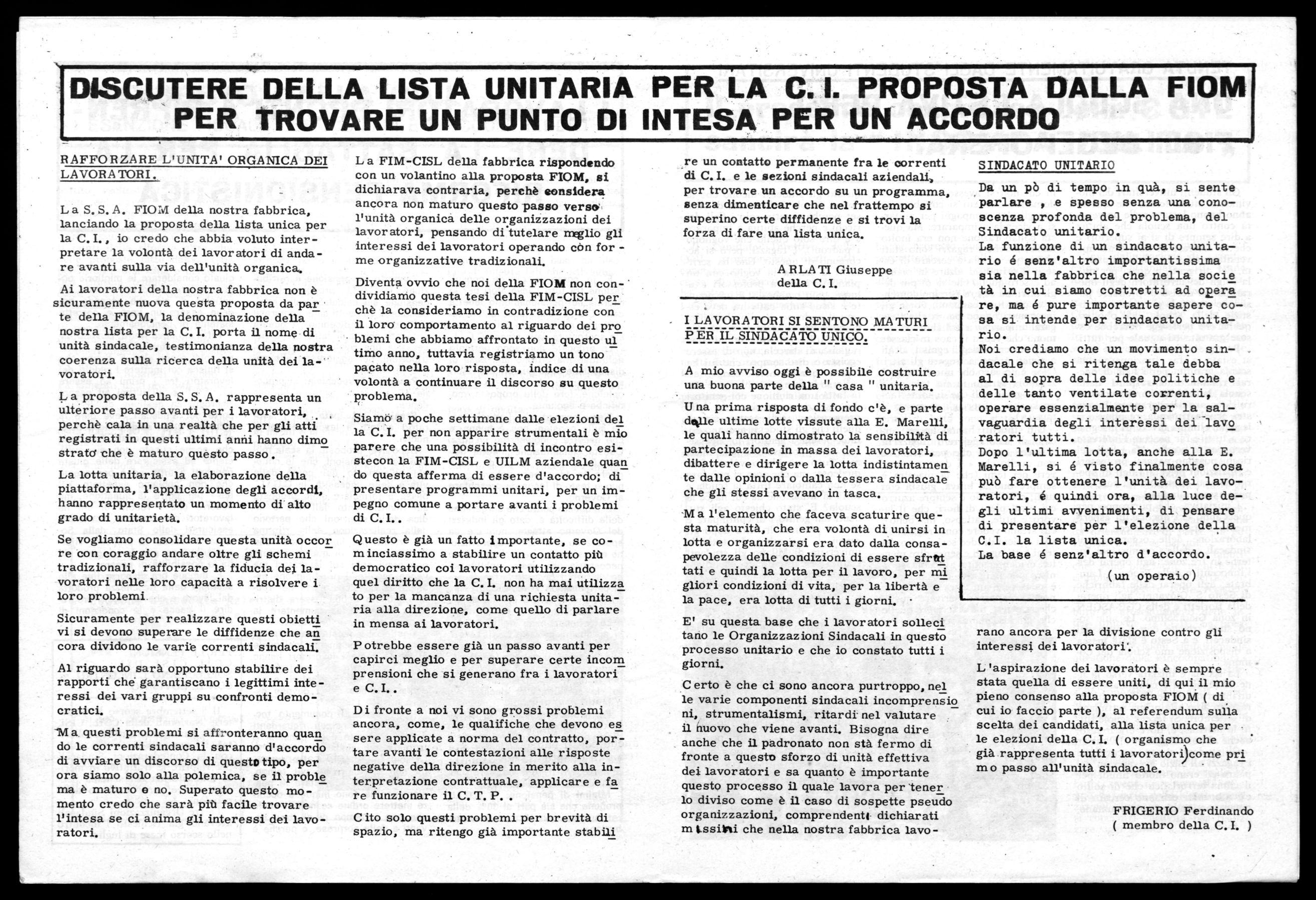 L 'aspirazione dei lavoratori è sempre stata quella di essere uniti, di qui il mio pieno consenso alla proposta FIOM ( di cui io faccio parte ), al referendum sulla scelta dei candidati, alla lista unica per le elezioni della C. I. ( organismo che già rappresenta tutti i lavoratori corne pri m o passo all'unità sindacale.