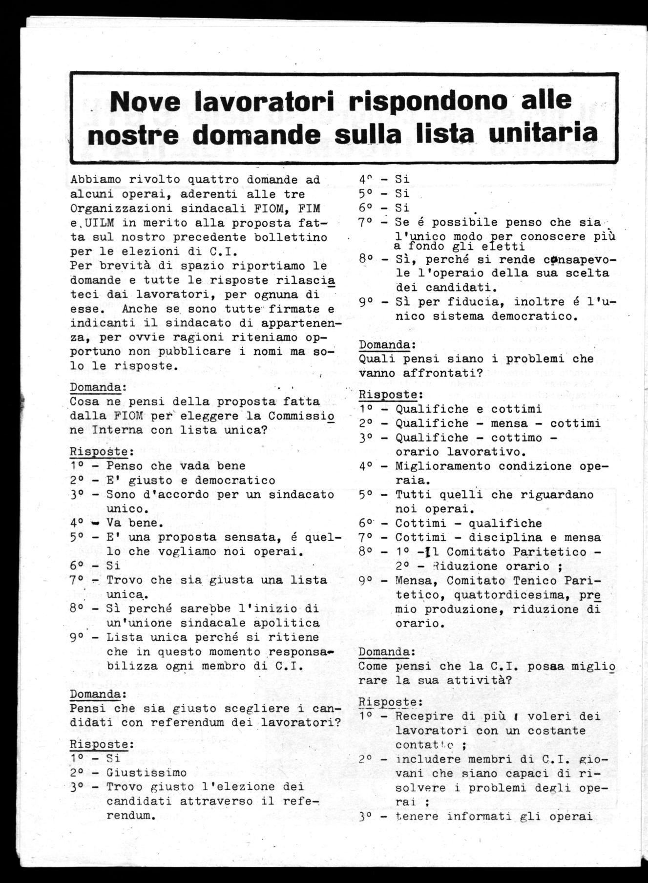 Abbiamo rivolto quattro domande ad alcuni operai, aderenti alle tre Organizzazioni sindacali FIOM, FIM e,UILM in merito alla proposta fatta sul nostro precedente bollettino per le elezioni di C.I. Per brevità di spazio riportiamo le domande e tutte le risposte rilascia teci dai lavoratori, per ognuna di esse. Anche se sono tutte firmate e indicanti il sindacato di appartenenza, per ovvie ragioni riteniamo opportuno non pubblicare i nomi ma solo le risposte.