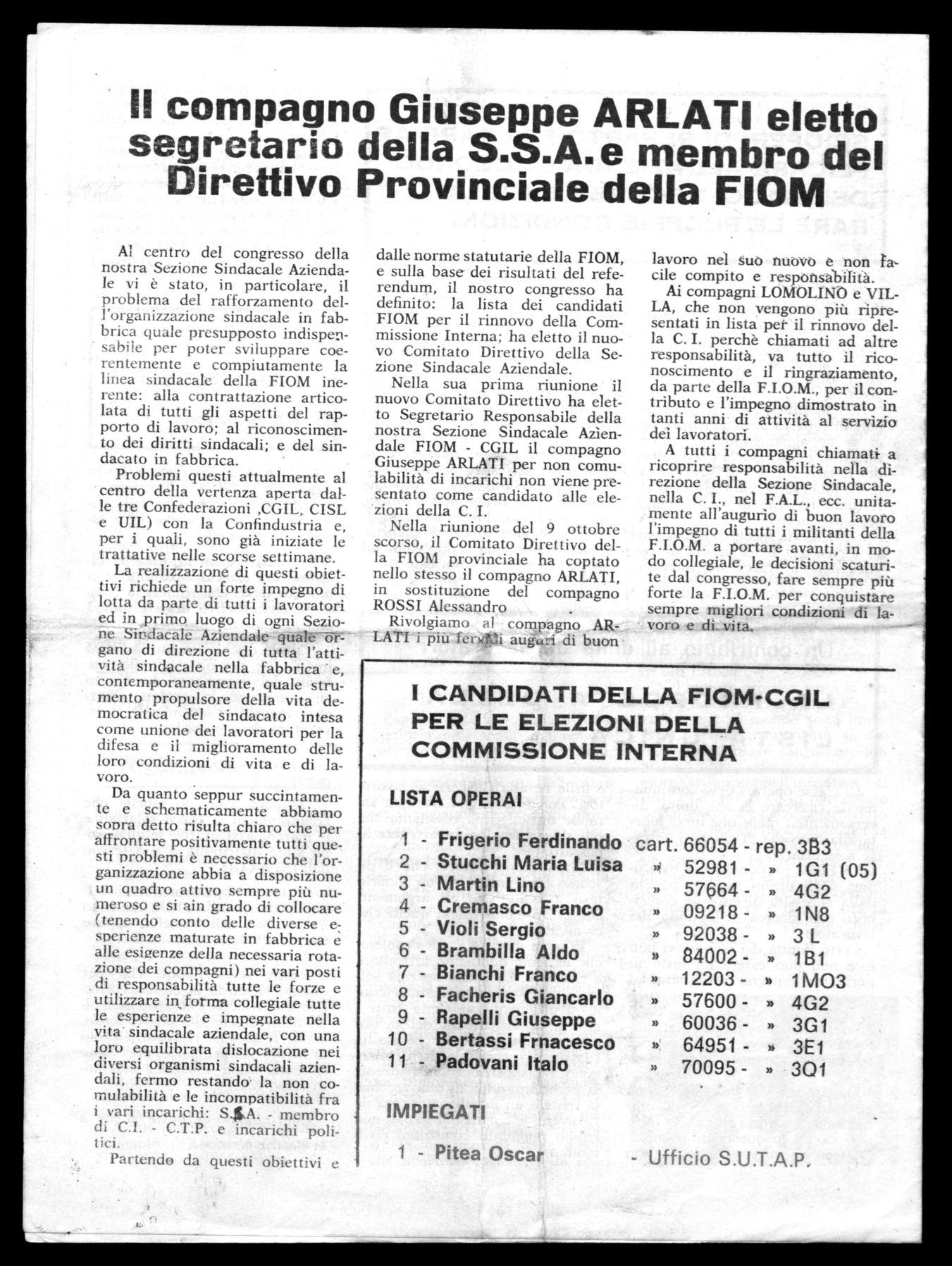 Nella sua prima riunione il nuovo Comitato Direttivo ha eletto Segretario Responsabile della nostra Sezione Sindacale Aziendale FIOM - CGIL il compagno Giuseppe ARLATI per non comulabilità di incarichi non viene presentato come candidato alle elezioni della C. I.