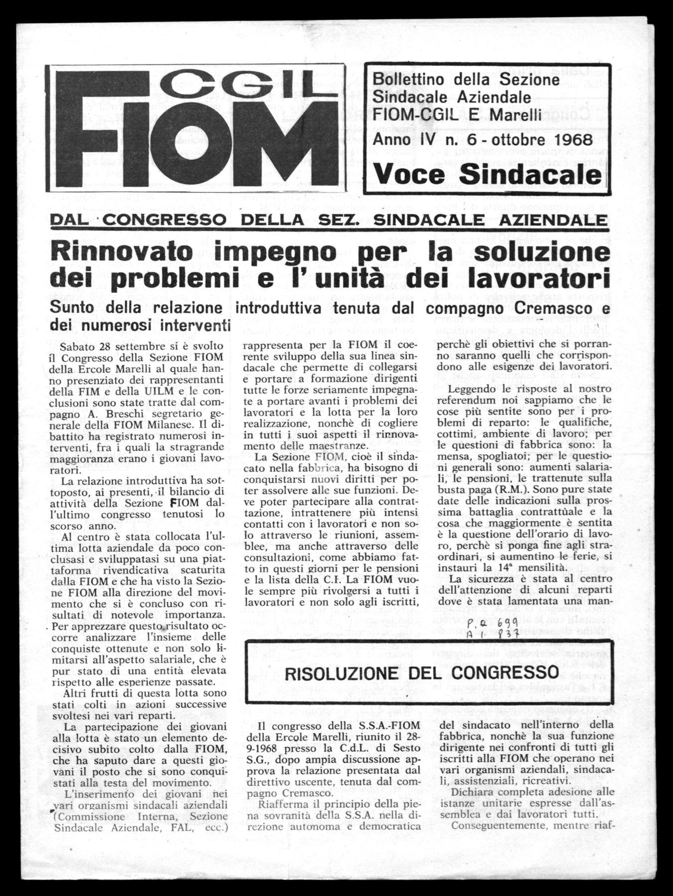 Il congresso della S.S.A.-FIOM della Ercole Marelli, riunito il 289-1968 presso la C.d.L. di Sesto S.G., dopo ampia discussione approva la relazione presentata dal direttivo uscente, tenuta dal compagno Cremasco.