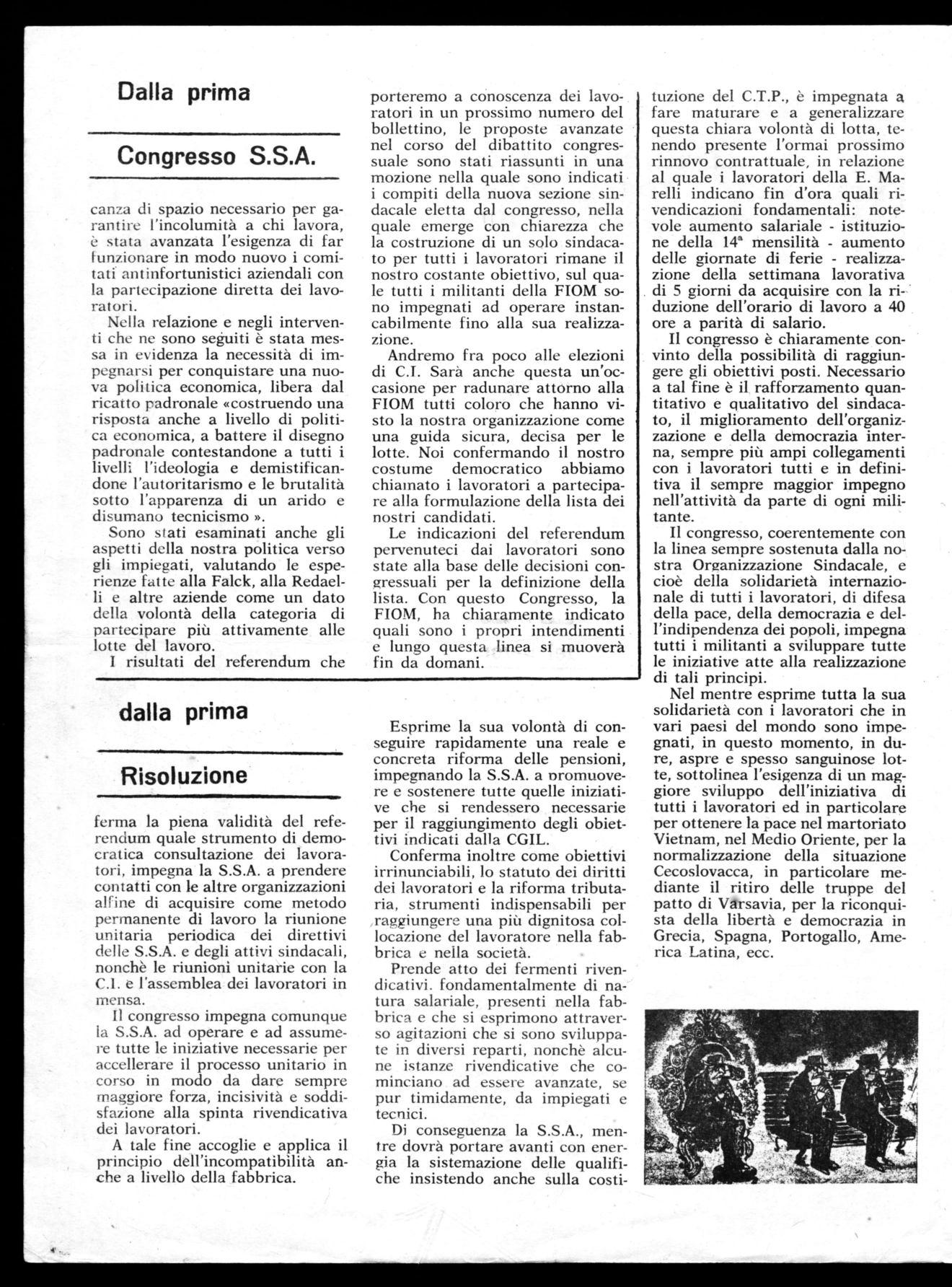 Al centro del congresso della nostra Sezione Sindacale Aziendale vi è stato, in particolare, il problema del rafforzamento dell'organizzazione sindacale in fabbrica quale presupposto indisperisabile per poter sviluppare coerentemente e compiutamente la linea sindacale della FIOM inerente: alla contrattazione articolata di tutti gli aspetti del rapporto di lavoro; al riconoscimento dei diritti sindacali; e del sindacato in fabbrica.
