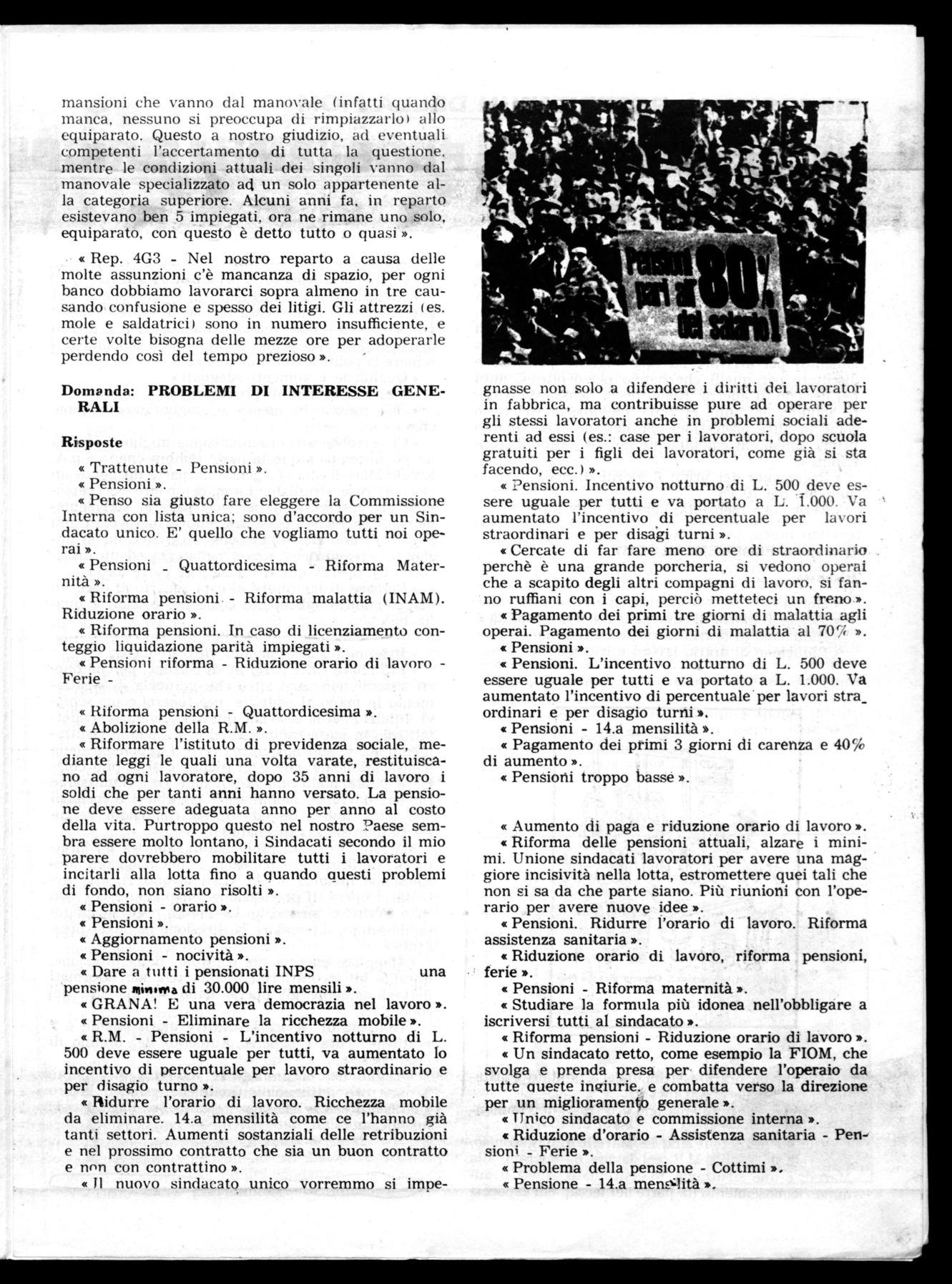La situazione nel 'nostro reparto non è tanto rosea, le qualifiche arrivano con il contagocce. in quantoche le qualifiche le danno solo a chi è capo linea, ci sono vari operai che lavorano ai banchi e montano macchine speciali purtroppo, questi non li passano; il problema del cottimo è assai duro: "ci sono (lei tempi imtxossibili e di giorno in giorno pegLiorano -empre ».