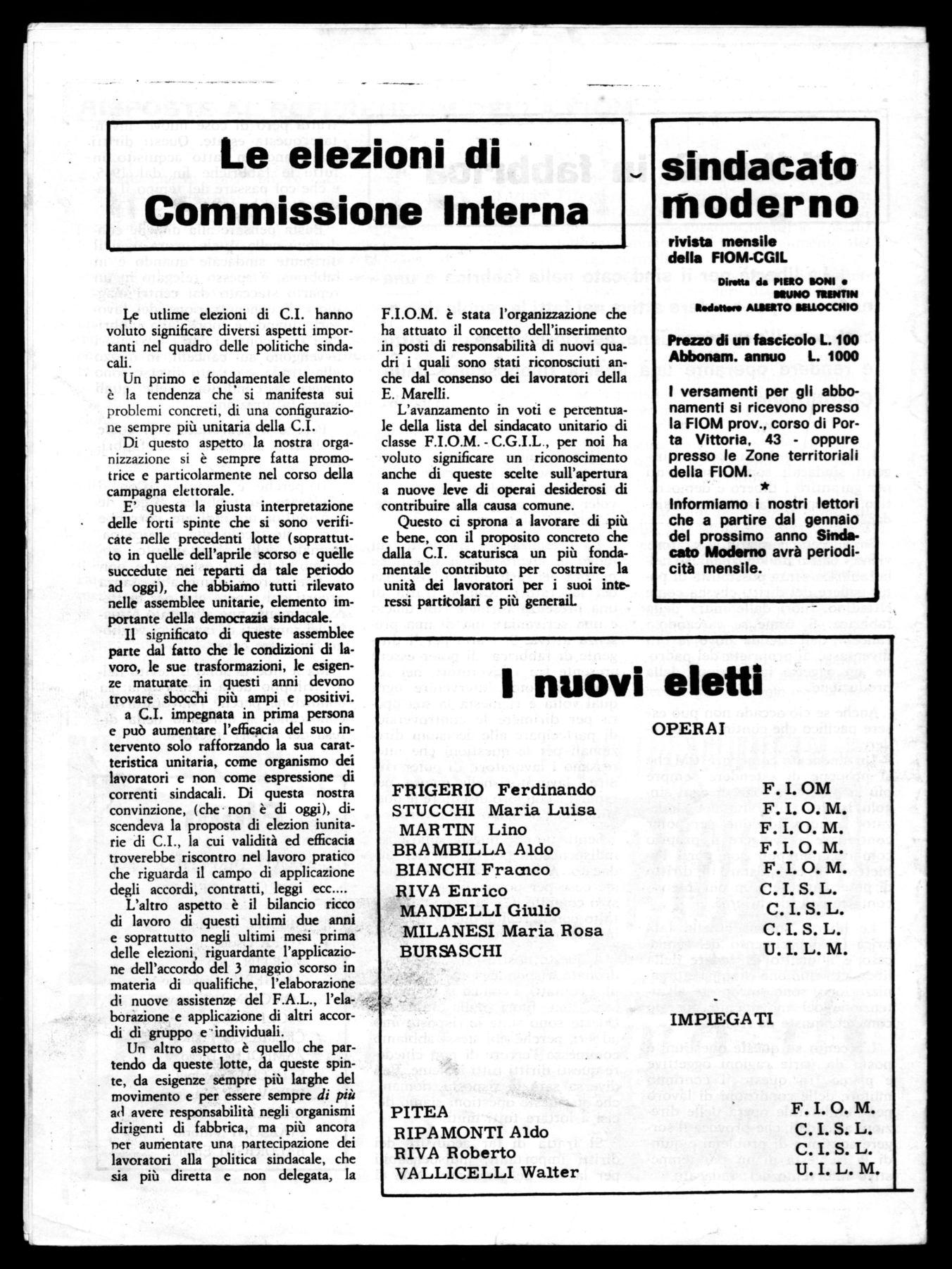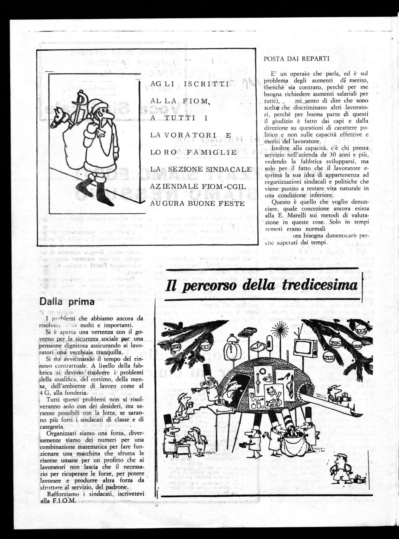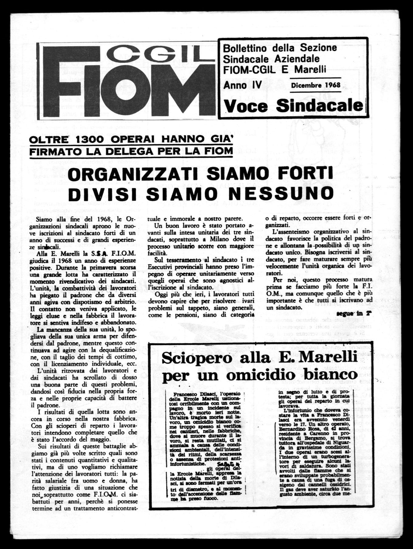 Alla E. Marelli la S.S.A. F.I.O.M. giudica il 1968 un anno di esperienze positive. Durante la primavera scorsa una grande lotta ha caratterizzato il momento rivendicativo dei sindacati. L'unità, la combattività dei lavoratori ha piegato il padrone che da diversi anni agiva con dispotismo ed arbitrio. Il contatto non veniva applicato, le leggi eluse e nella fabbrica il lavoratore si sentiva indifeso e abbandonato.