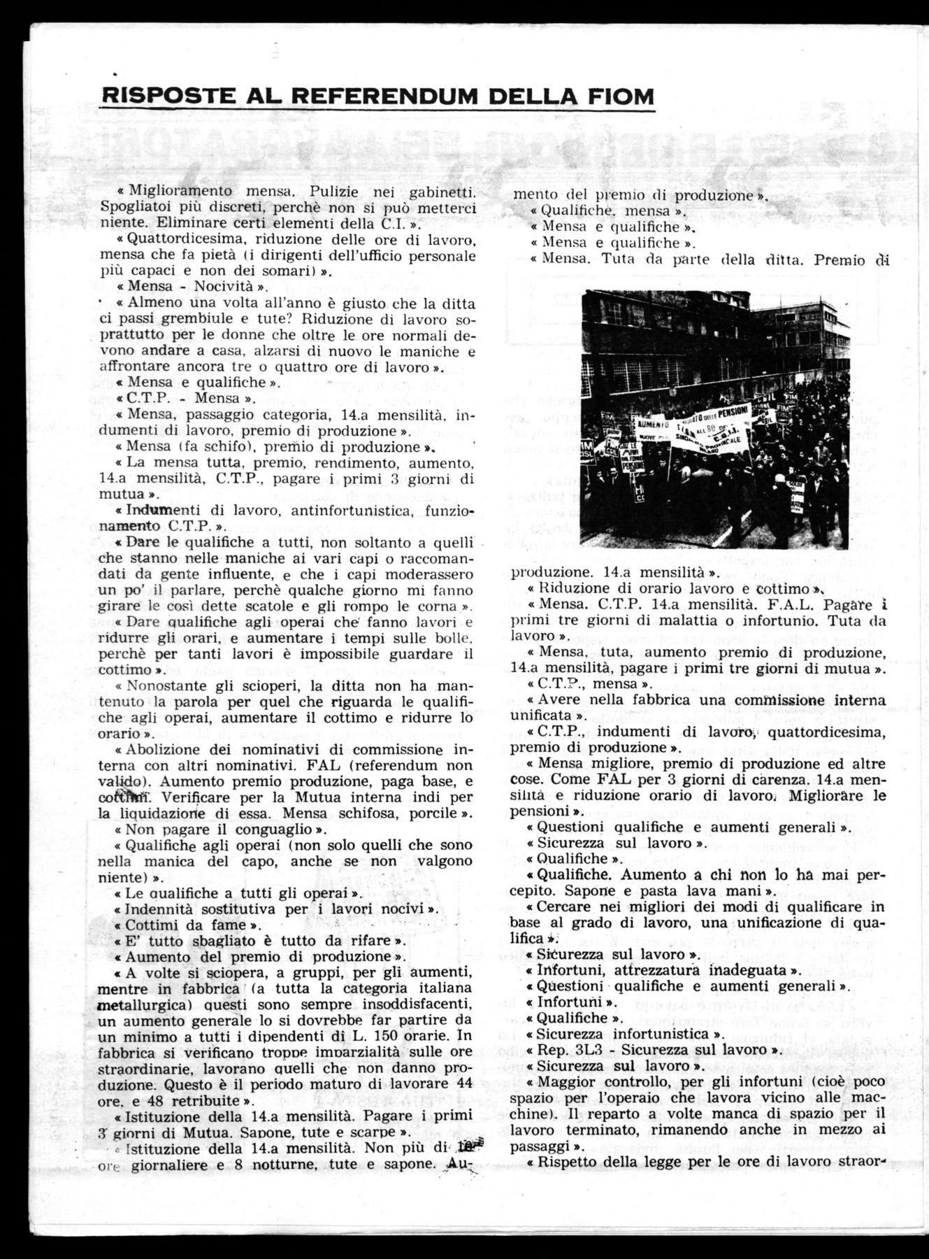 « Migliorare l'entrata e l'uscita delle donne, del • deposito delle biciclette. perchè attualmente crea difficoltà e perdite di tempo e smettere di considerare certe uscite solo per impiegati, perchè è una mentalità che contrasta l'effettivo avanzamento della classe operaia ».