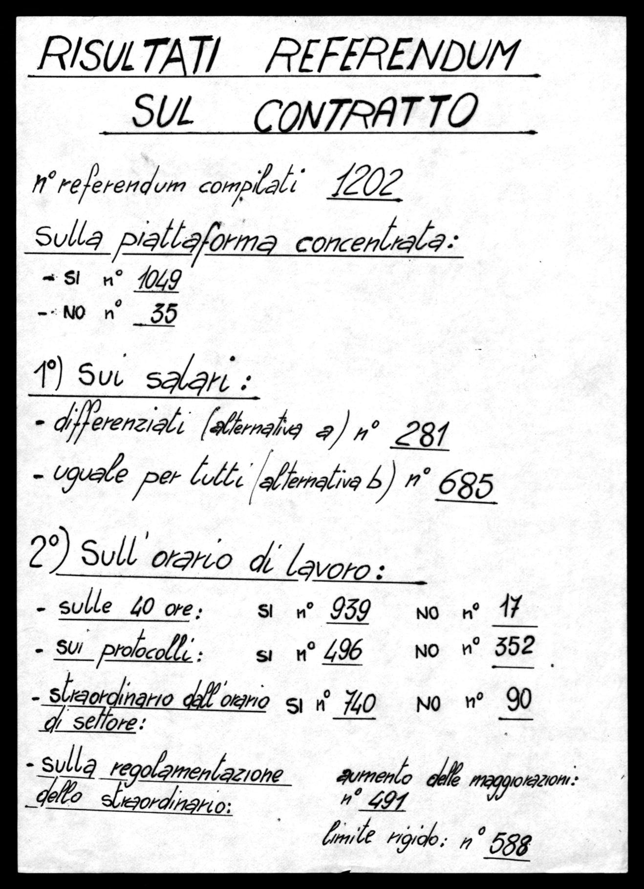 Il referendum ha dato delle indicazioni importanti sulle condizioni di lavoro gravi e disagiate di alcuni reparti, inoltre-ho risposto sui problemi rivendicativi che serviranno di orientamento alla nostra organizzazione.