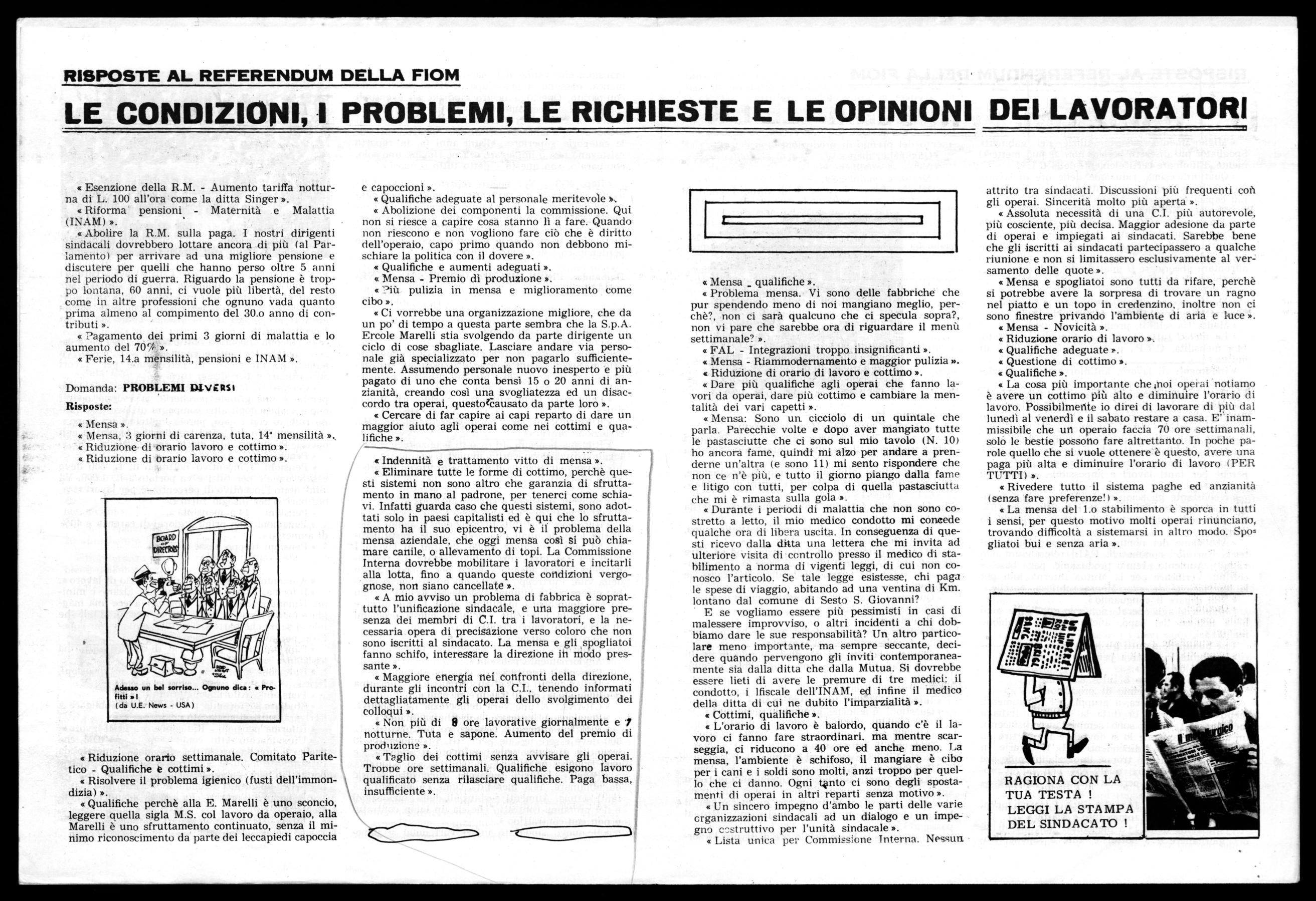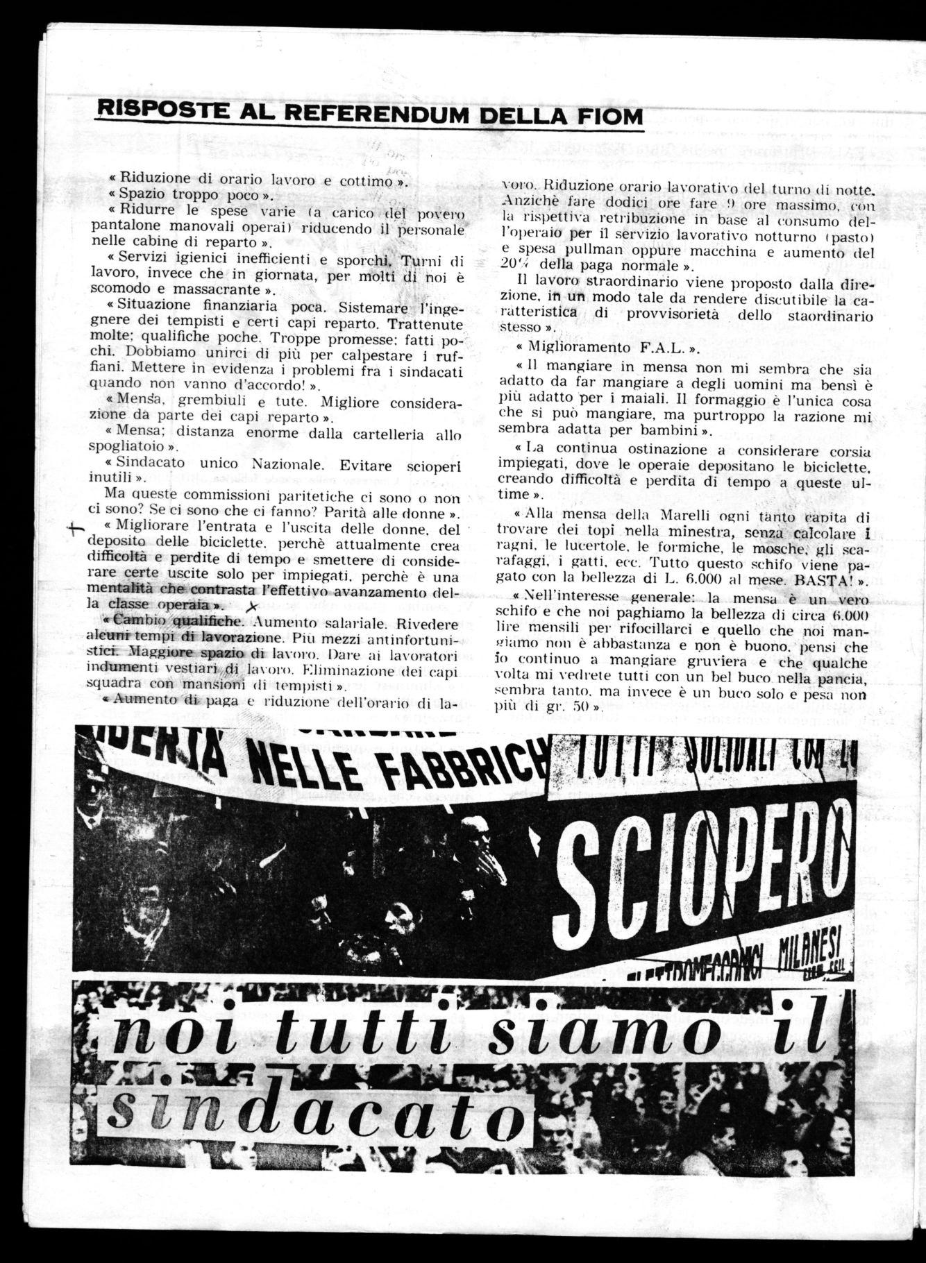 «.Alla mensa della Marelli ogni tanto capita di trovare dei topi nella minestra, senza calcolare ragni, le lucertole, le formiche, le mosche, gli scarafaggi, i gatti, ecc. Tutto questo schifo viene pagato con la bellezza di L. 6.000 al mese. BASTA! ».