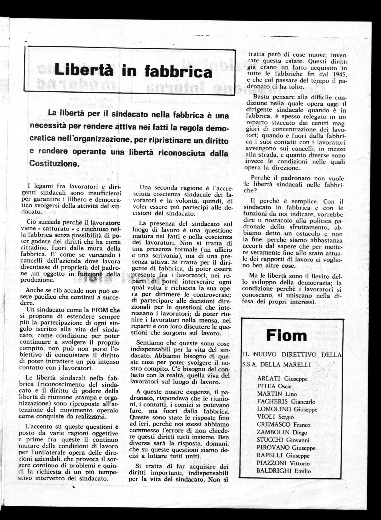 La libertà per il sindacato nella fabbrica è una necessità per rendere attiva nei fatti la regola democratica nell'organizzazione, per ripristinare un diritto e rendere operante una libertà riconosciuta dalla Costituzione.